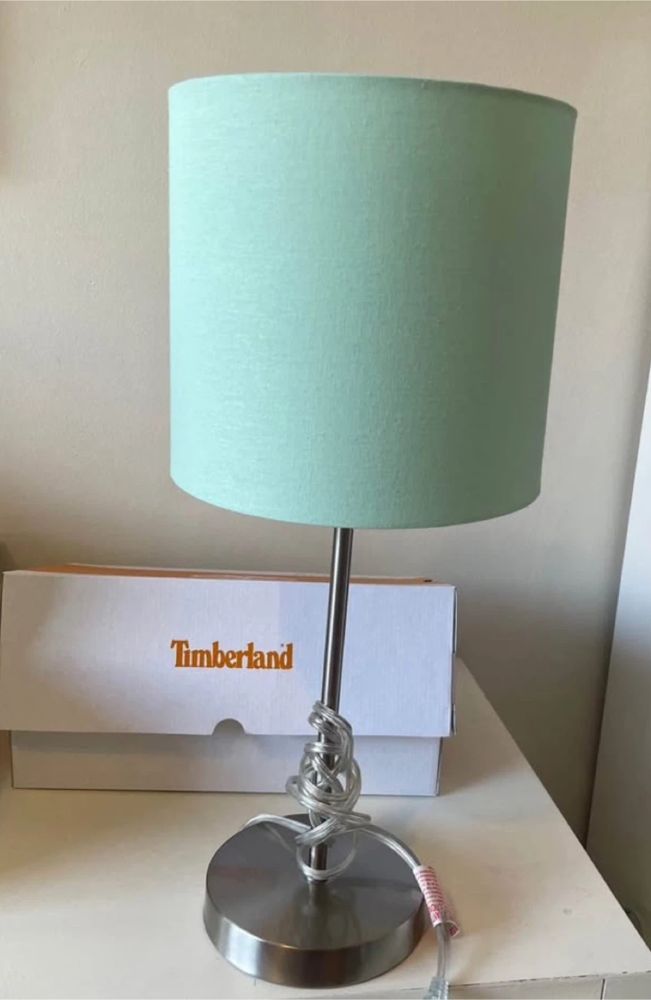 36Here's a cute lamp with a mint green shade! It has a silver base and the original Timberland box is included. Perfect for adding a pop of colour to any room