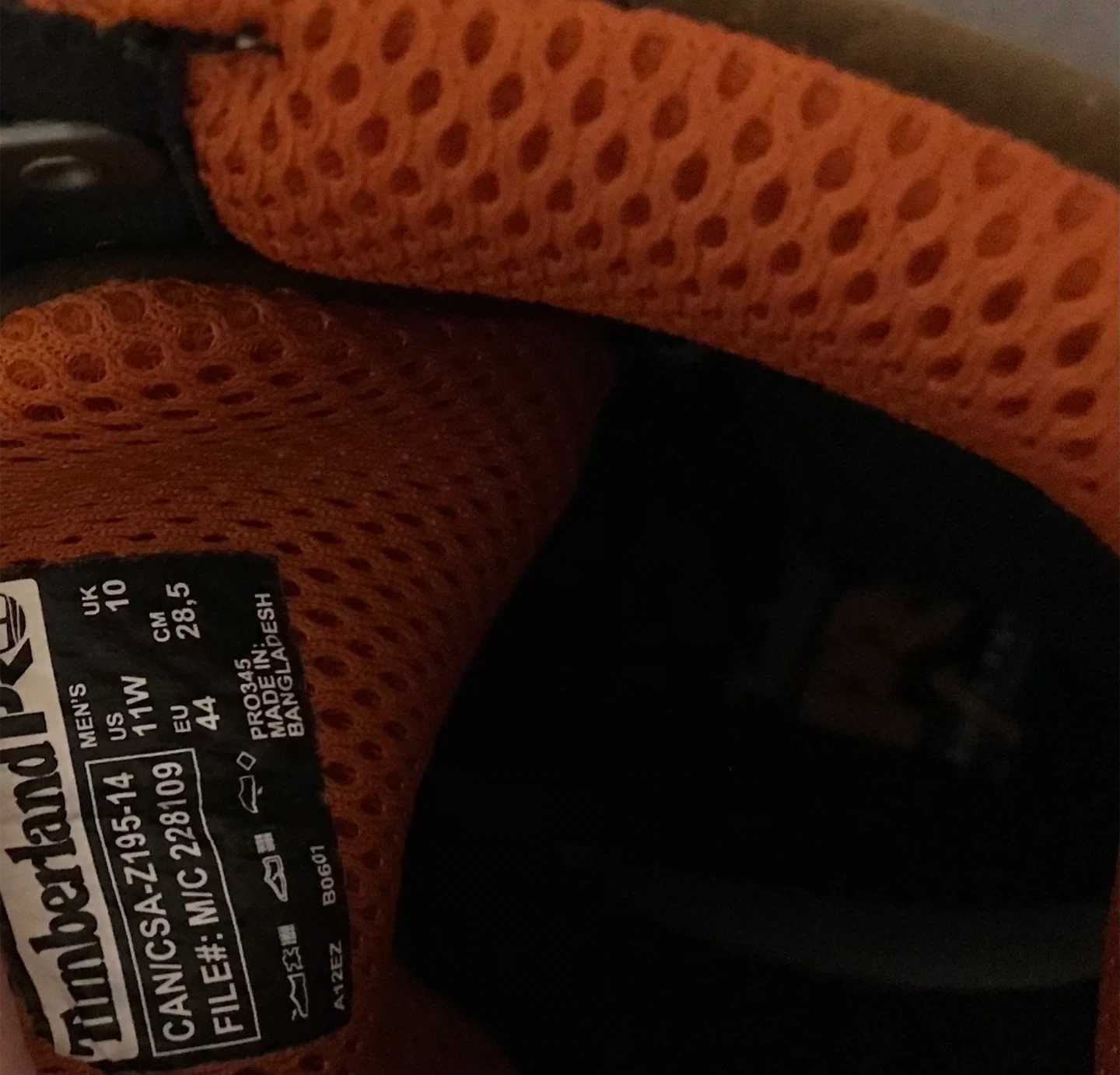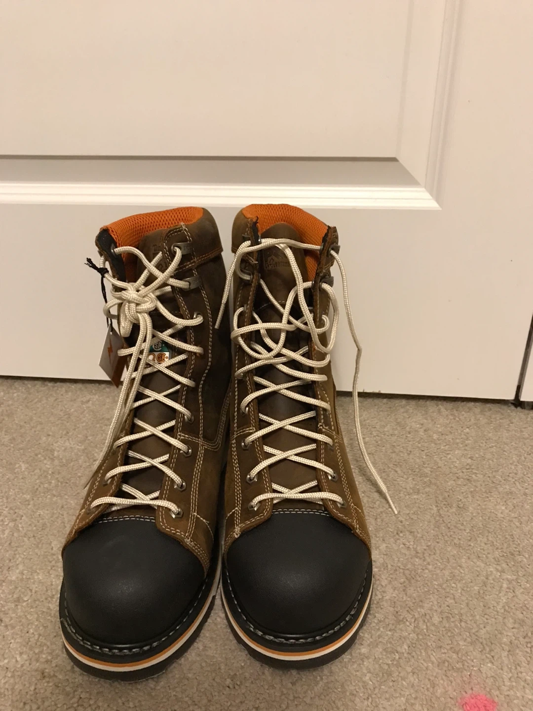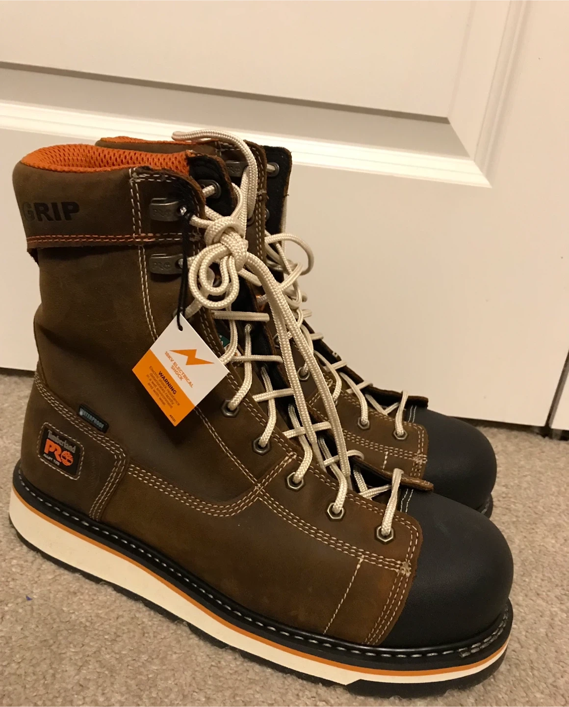 10These Timberland PRO work boots are new with tags. They're a men's size 11 and feature a waterproof design. The model number is Z195-14. They have a brown leather exterior with a black toe cap. They retail for $269.