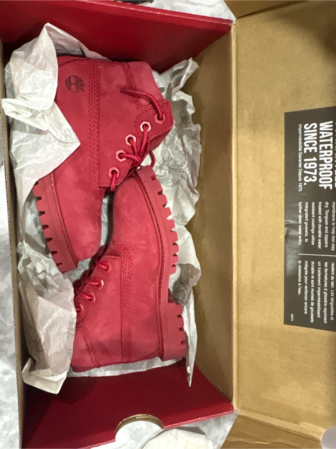 65These Timberland boots are in excellent condition and ready for any weather! The vibrant red colour is sure to make a statement, and the waterproof design will keep your feet dry and comfortable. They are a size 7 toddler
