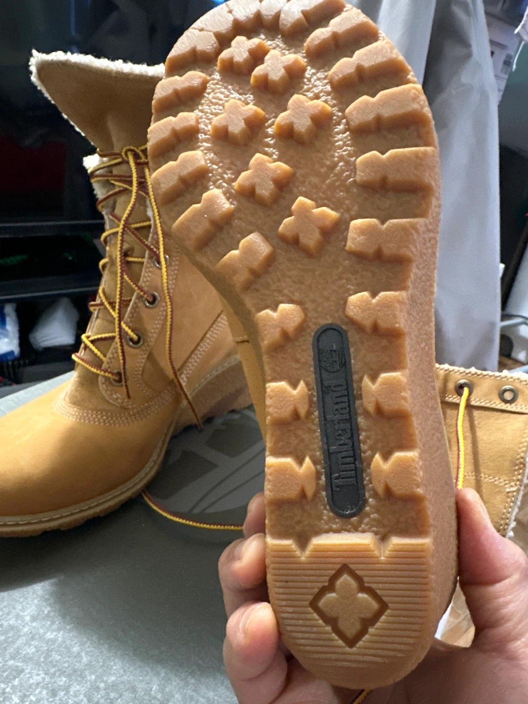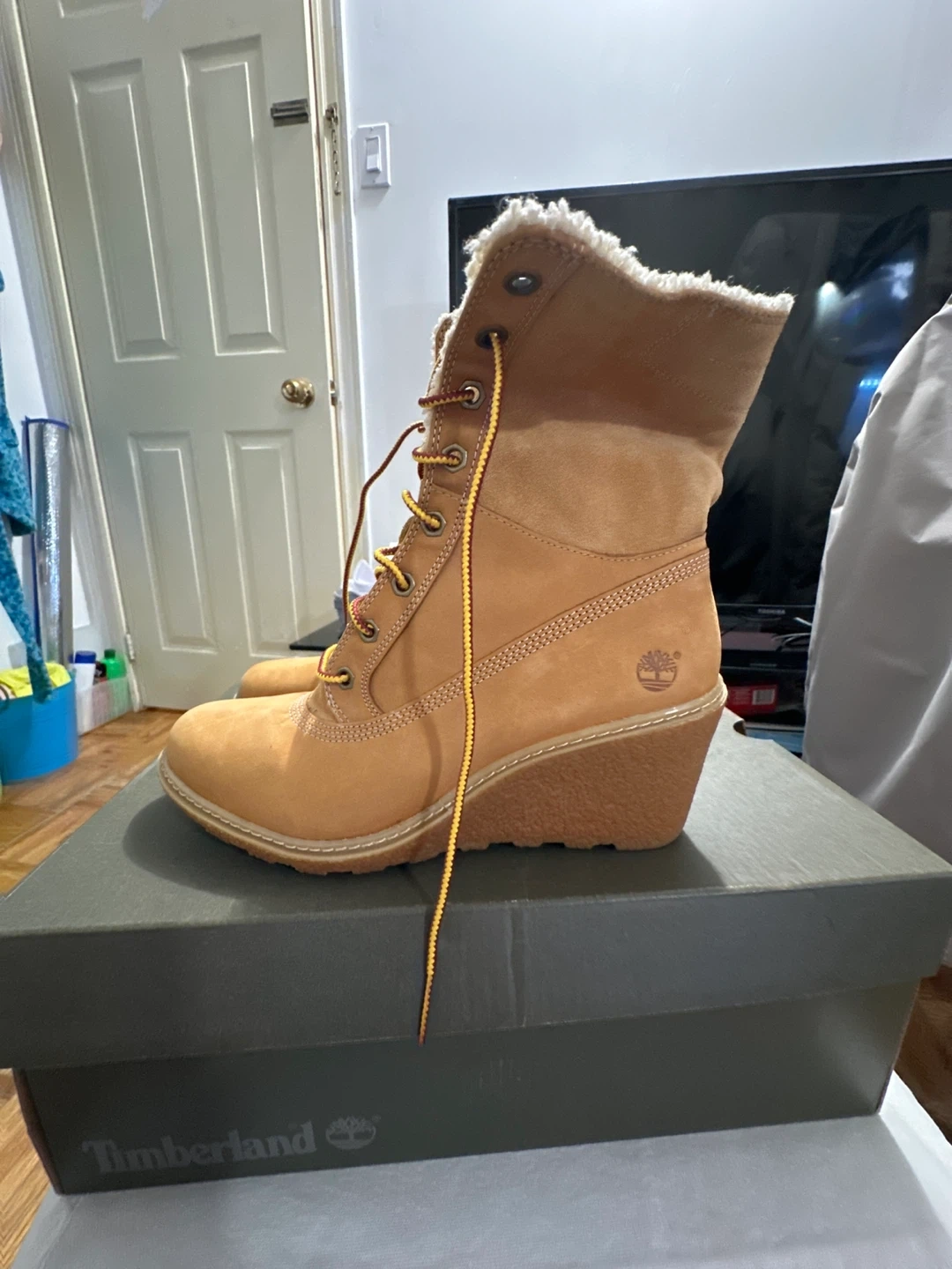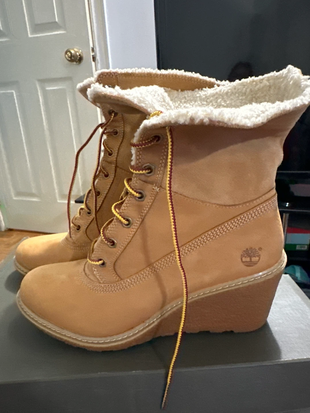 10Selling a pair of Timberland wedge heel boots. They're in great condition and come with the original box! These are a stylish and comfortable choice for the colder months.