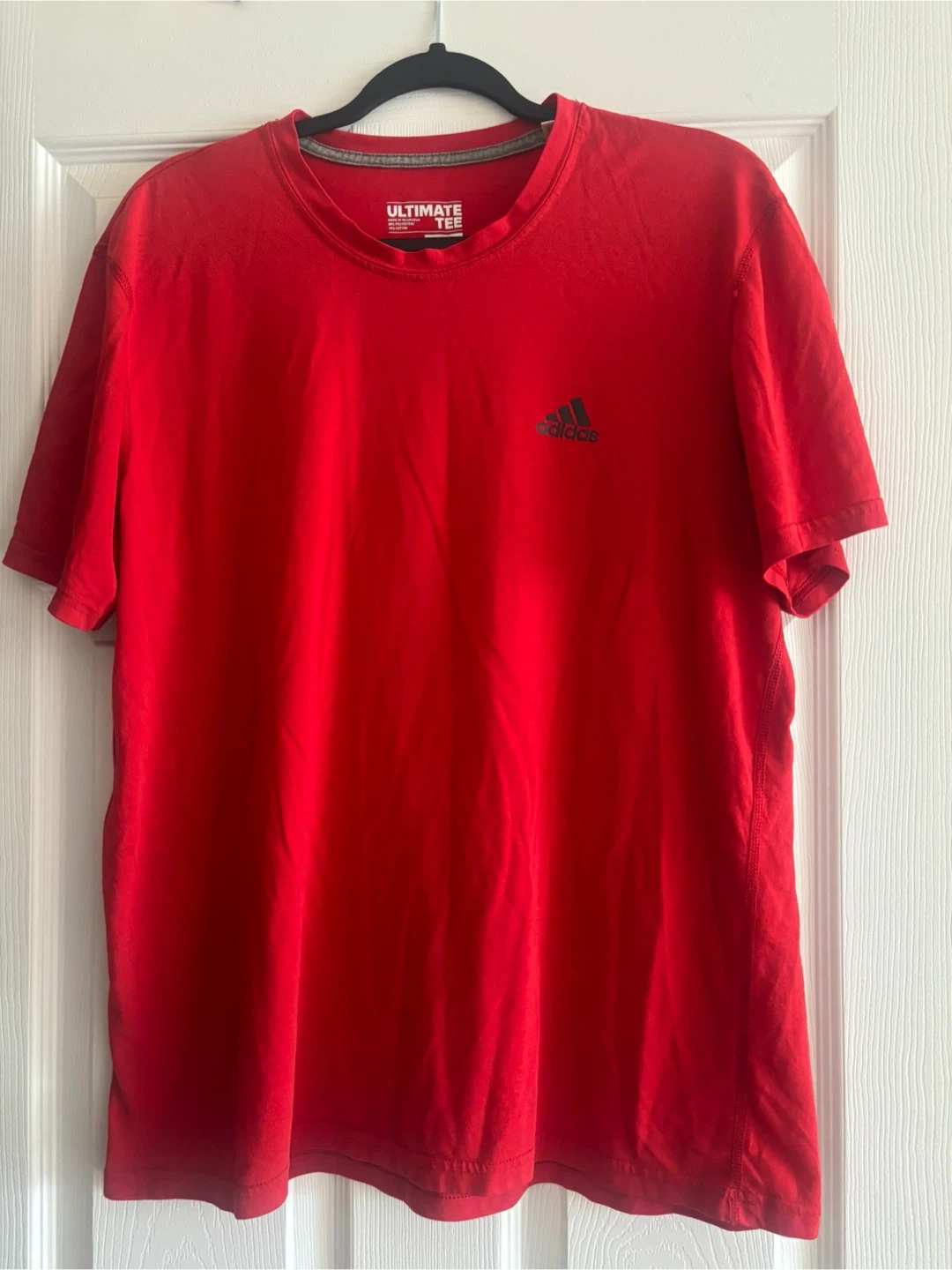 This is a red Adidas t-shirt with the "Ultimate Tee" label. It's made of a comfortable, breathable fabric. It's great for casual wear or athletic activities.