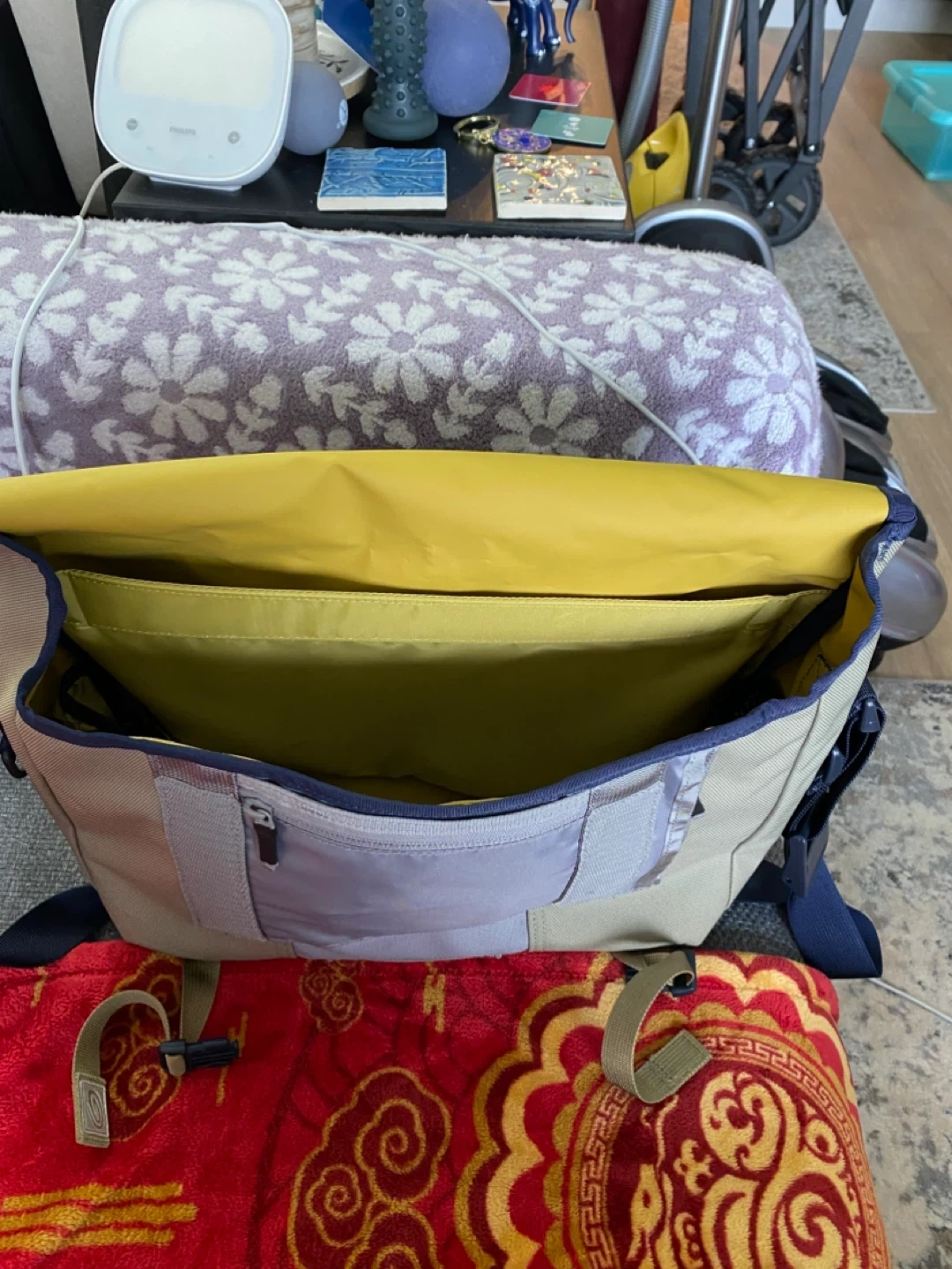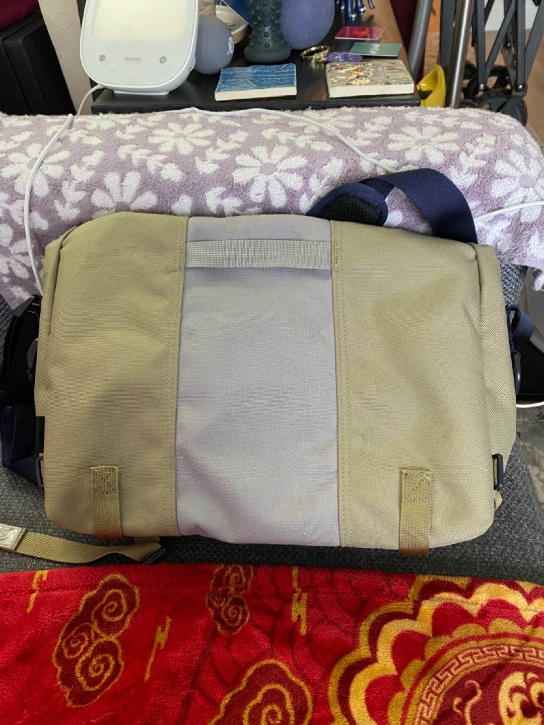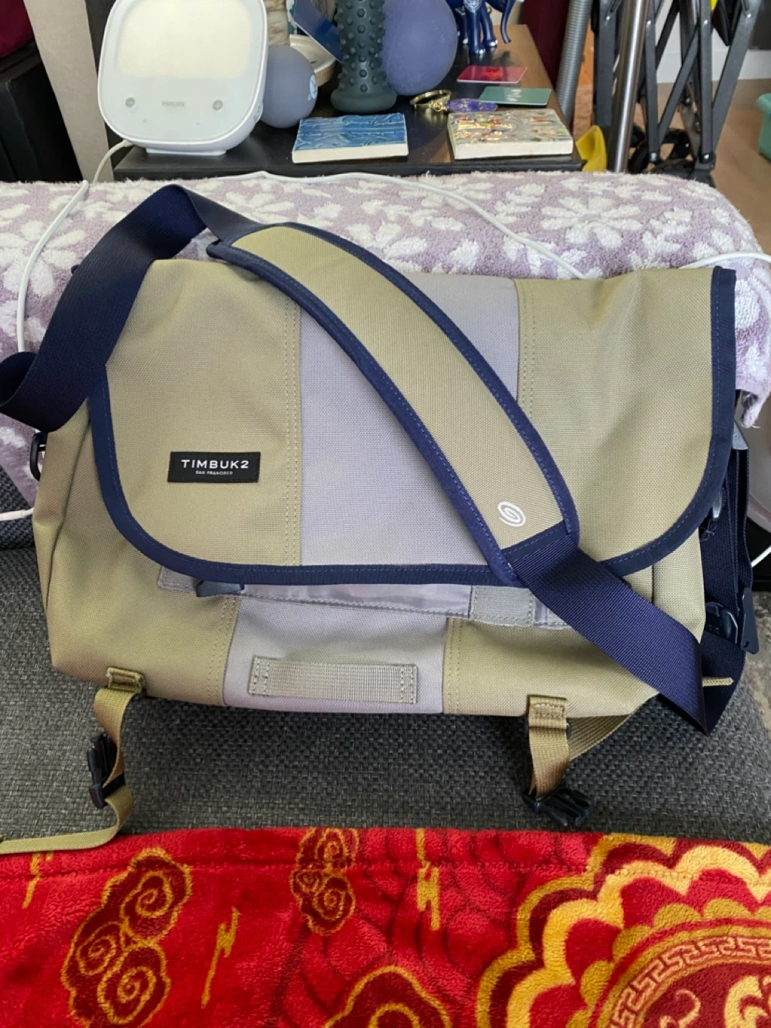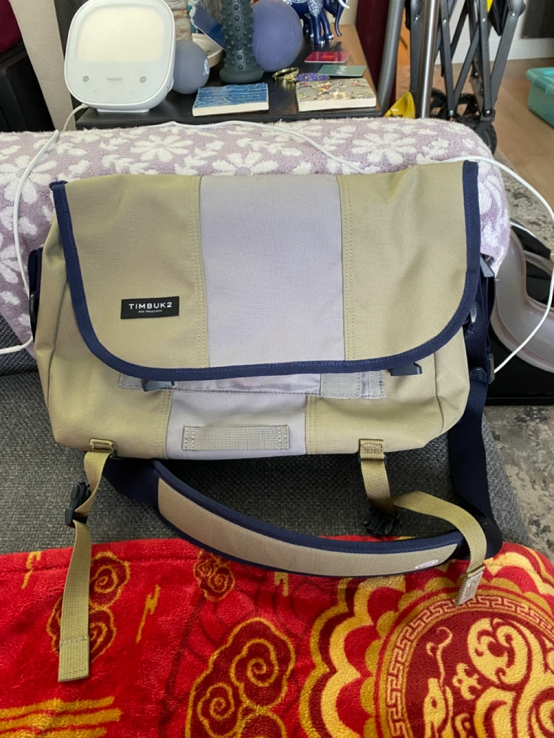 Timbuk2 messenger bag in a tan and gray color scheme with navy blue accents. It's in great condition and ready for a new owner! The bag features multiple compartments and a comfortable shoulder strap. Dimensions are approximately 15.2 x 13.0 x 5.12 inches. This has only been used twice. Brand new is $149. Will fit a Small: 14” laptop. Dimensions: Look at the last photo Link here: https://timbuk2.ca/collections/laptop-bags-work-briefcases/products/2023-classic-messenger-bag?variant=40976458940464 Pickup in Kitsilano