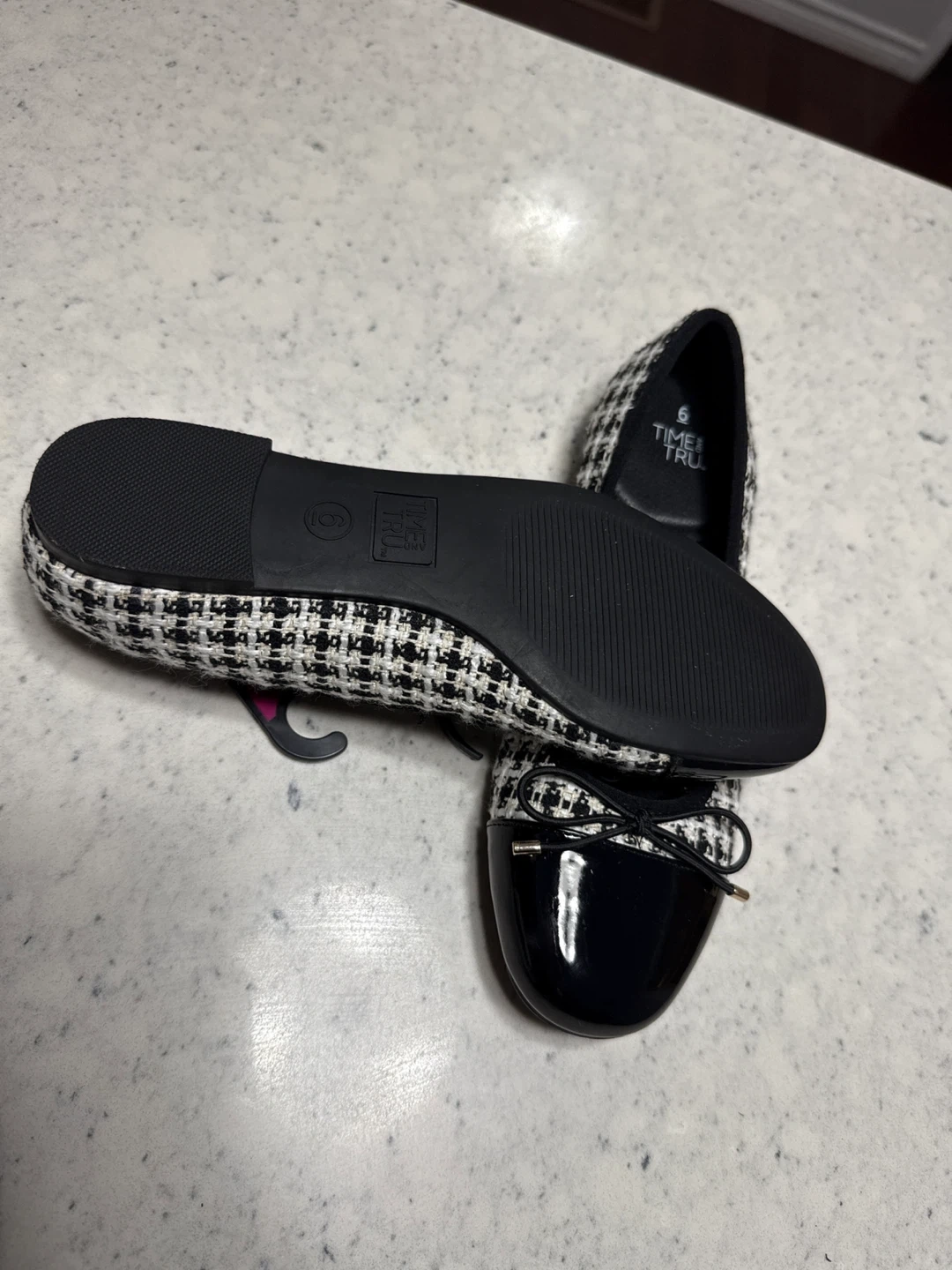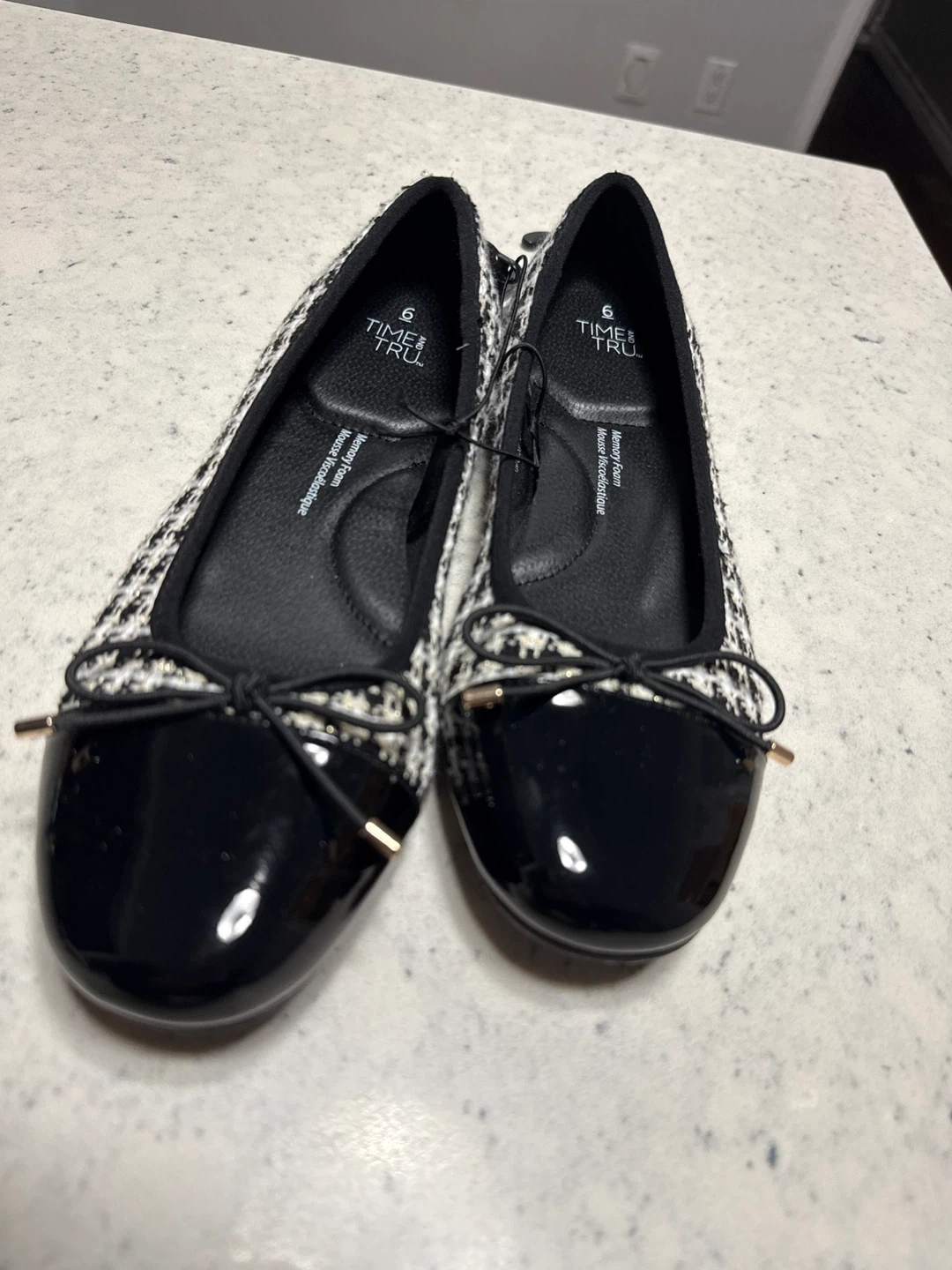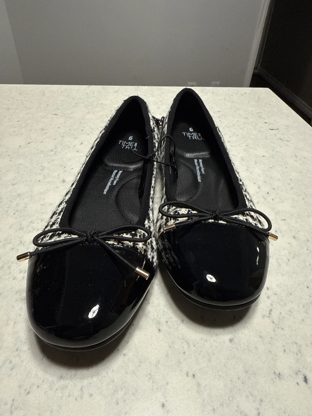Selling a pair of Time and Tru ballet flats in size 6. They feature a classic design with a black patent leather toe cap and a tweed-like fabric body. These flats are perfect for everyday wear and are in great condition!