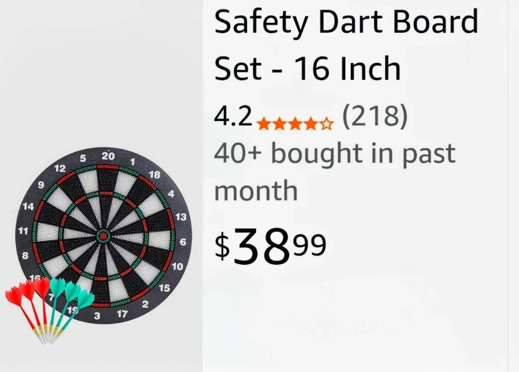 It's not just for kiddos. This dart board is great for adults as well. You can play Darts anywhere without causing any damage to walls or furniture. Darts set includes a 16-inch safety dart board with pliable soft dart tips for safe play. The plastic-tipped darts grip the board for accurate shots. It comes with a hanging bracket. Or can be hung on wall. Never used.
