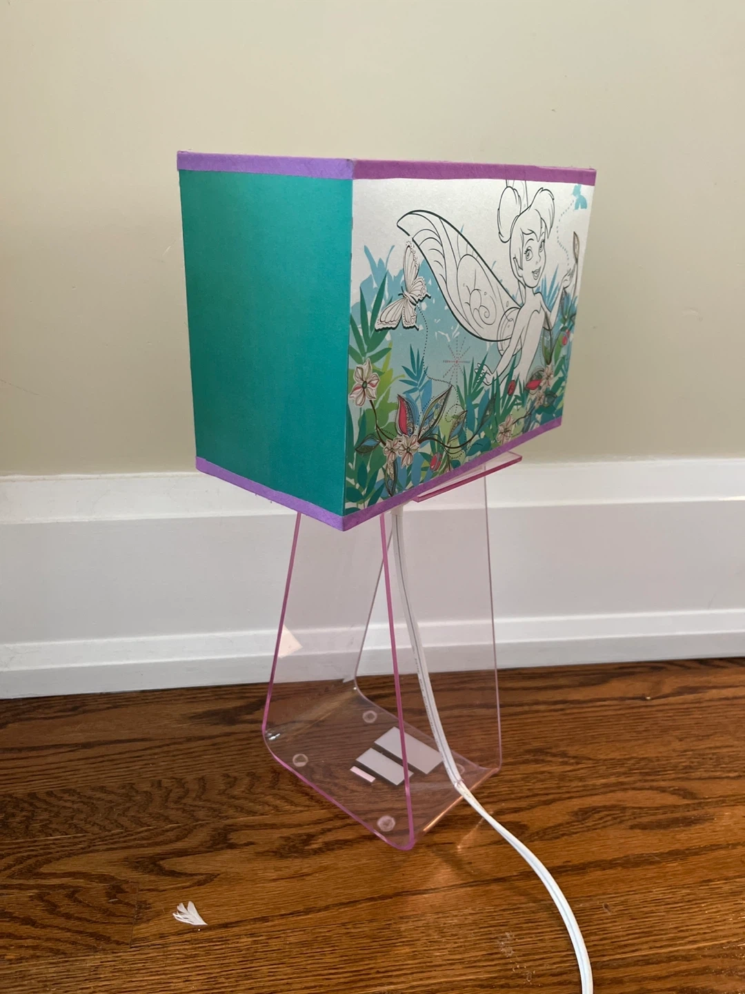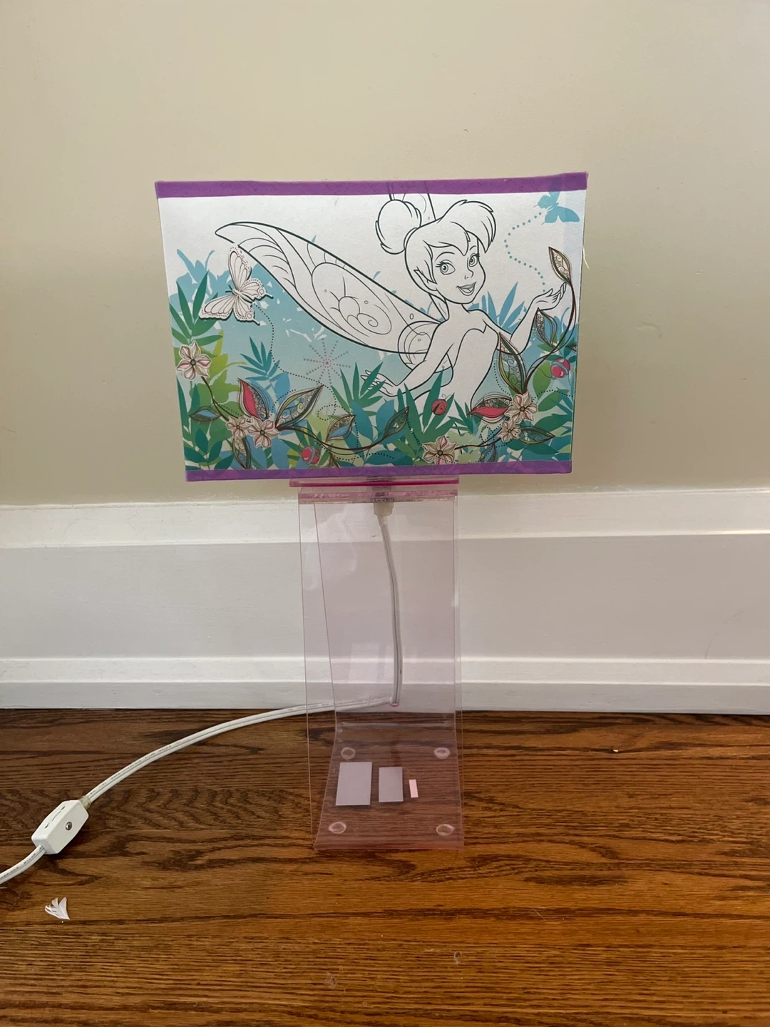 This adorable Tinkerbell table lamp is perfect for a child's room! It features a colourful design with Tinkerbell and floral accents. It’s in good condition.