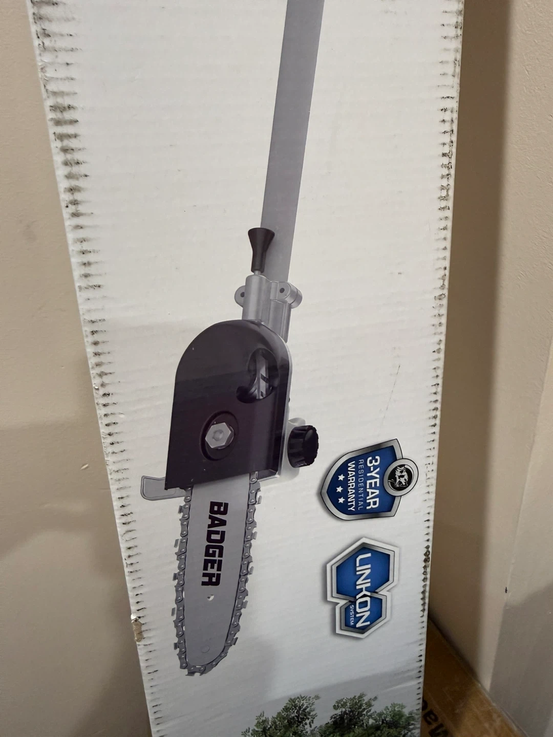 This Badger Power rotary pruner attachment features a 10" blade and an automatic oiler. It has a rotating head that adjusts up to 90 degrees for angled cuts. Comes with a 3-year residential warranty and is compatible with the Linkon system.