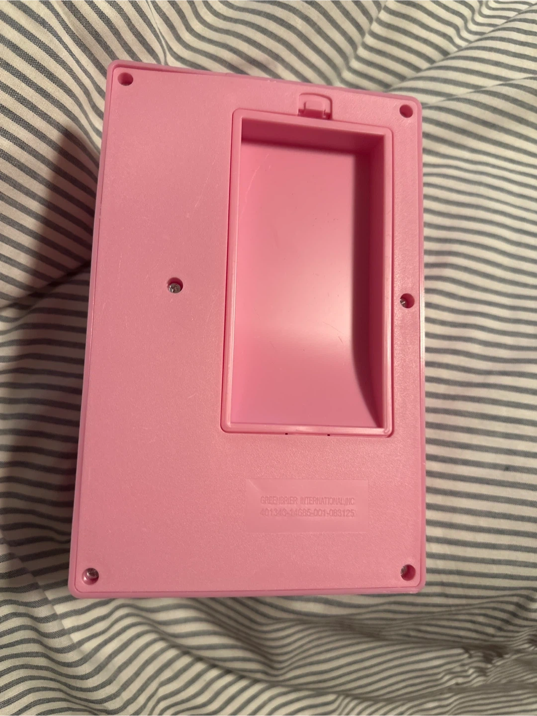 This is a pink toy vending machine. It's designed to look like a real vending machine with a keypad and a dispensing slot. It's great for holding small toys or organizing small items. Perfect for a child's room!