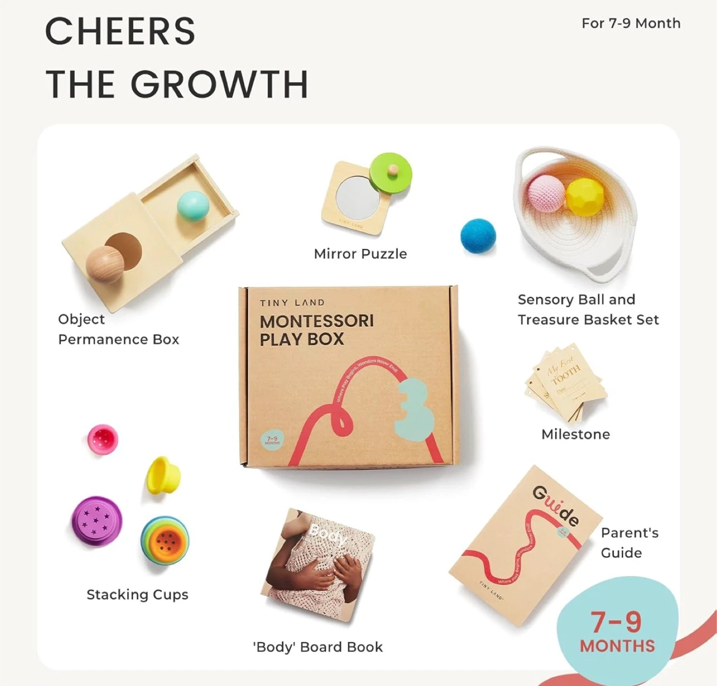 Selling a Brand New Tiny Land Montessori Play Box, perfect for little ones aged 7-9 months! This set includes a variety of toys designed to stimulate your baby's development.