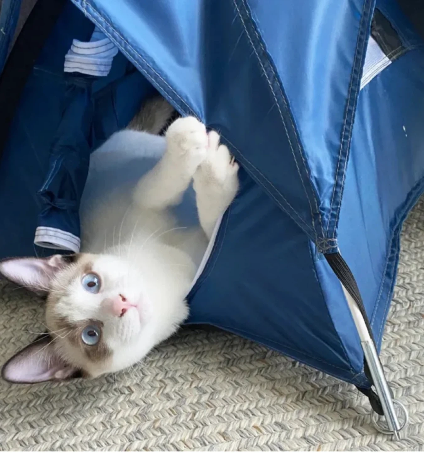 83The Tiny Tents Sky Blue Tiny Tent brings all the features and functionalities of a regular-sized tent in a 12-inch tall tent, which makes it perfect for your pet (small breed dogs or cats) or even for your own entertainment. All you'll have left to do is find the best spot to set camp! This lightweight yet durable tent comes in a practical and easy-to-carry travel bag along with all the plastic tent poles and a removable rain fly. The tiny tent features two zipper side doors with zipper windows, zipper mesh windows on both sides for ventilation, a durable tarpaulin floor, interior stash pockets for stowing really tiny accessories and a mesh stargazer roof; no detail has been spared in the design of this product