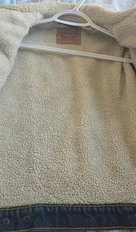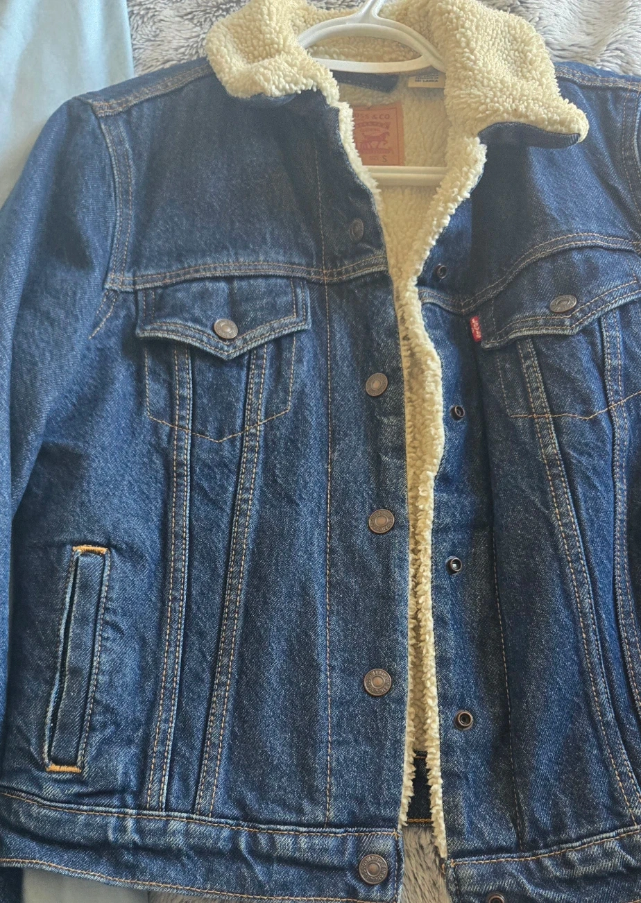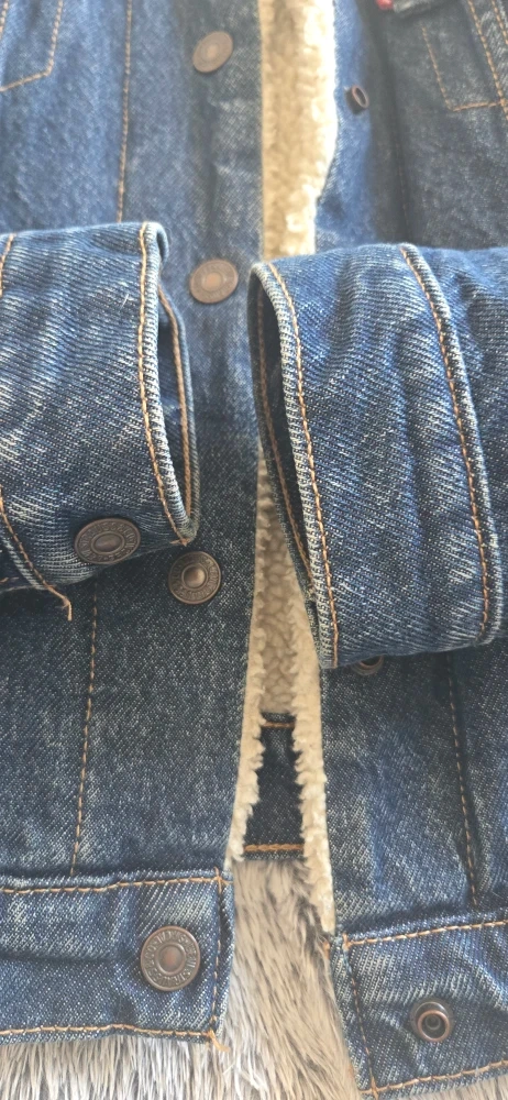 Cozy up in this Levi's denim trucker jacket with a warm sherpa lining! It's in excellent conditions and ready for a new home. Perfect for adding a touch of classic style and warmth to your wardrobe.