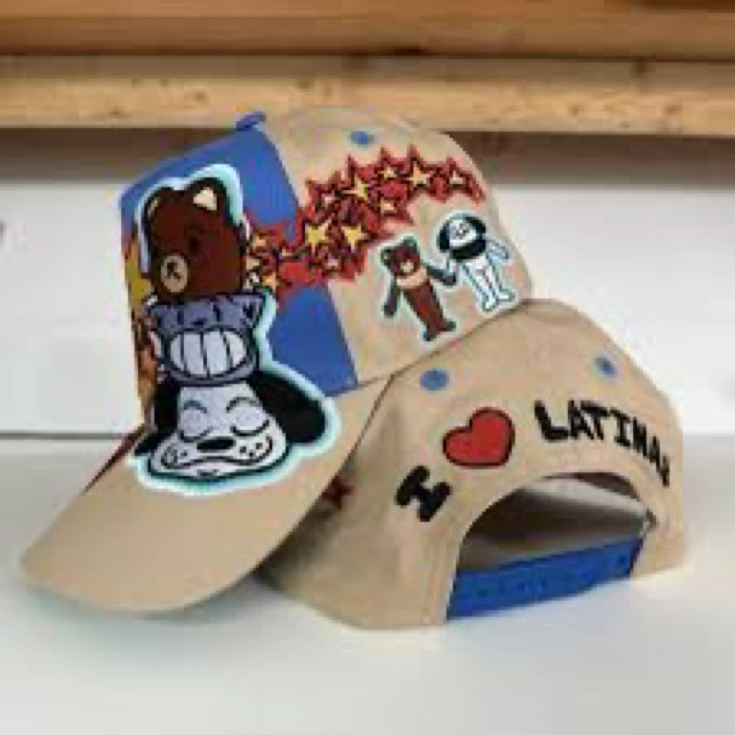 This is a graphic baseball cap featuring cartoon characters and embroidery. It has a "I Love Latina" design on the back and a blue adjustable strap. The cap's main colour is tan with blue and red accents.