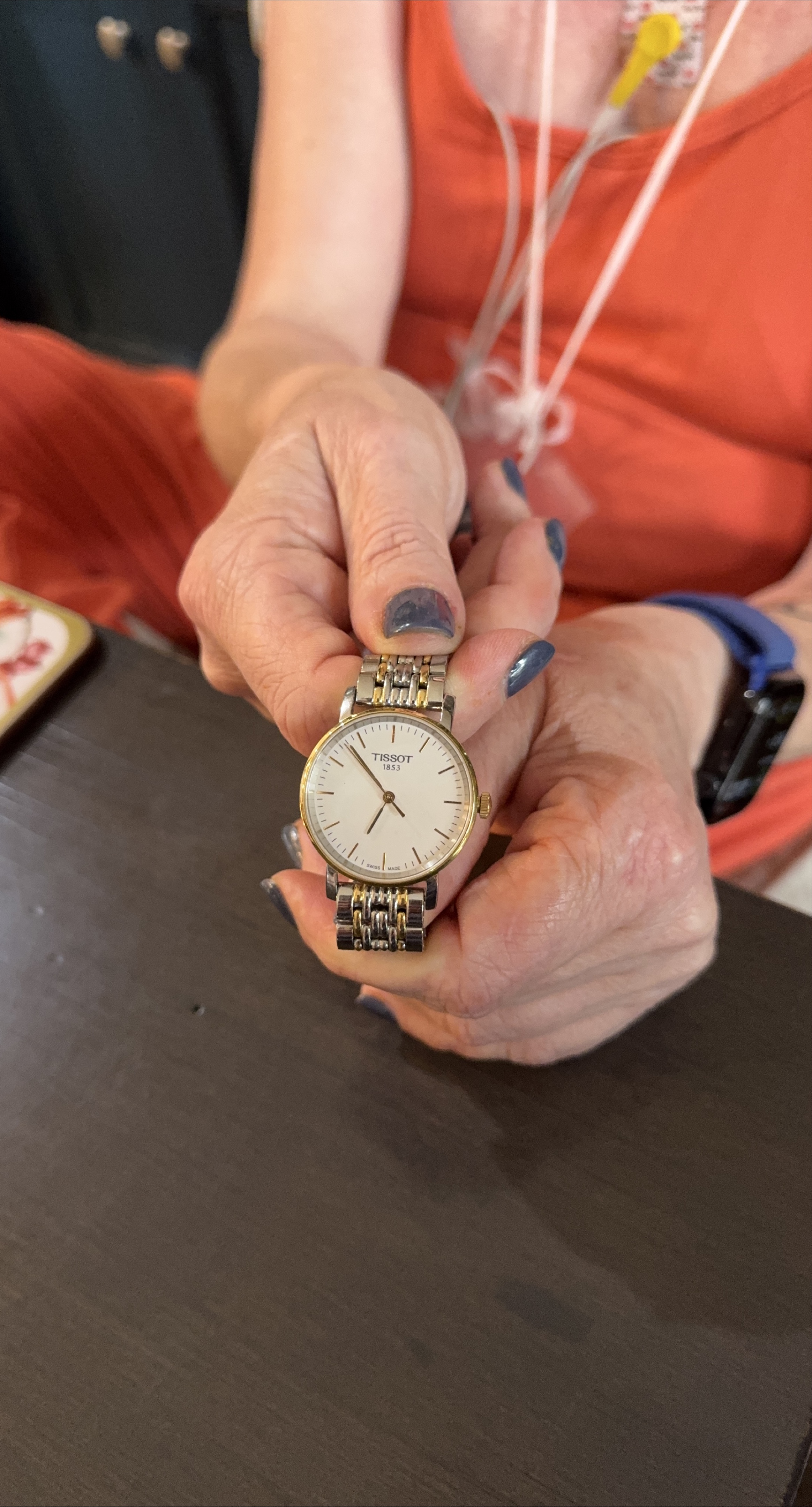 Selling a Tissot 1853 Swiss made watch. It features a white face and a two-tone band. It is made with sapphire crystals and stainless steel Metal that is water resistant.