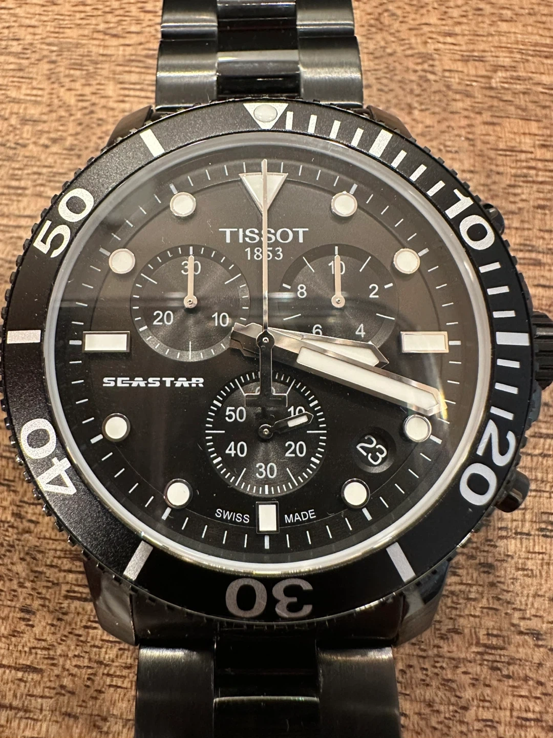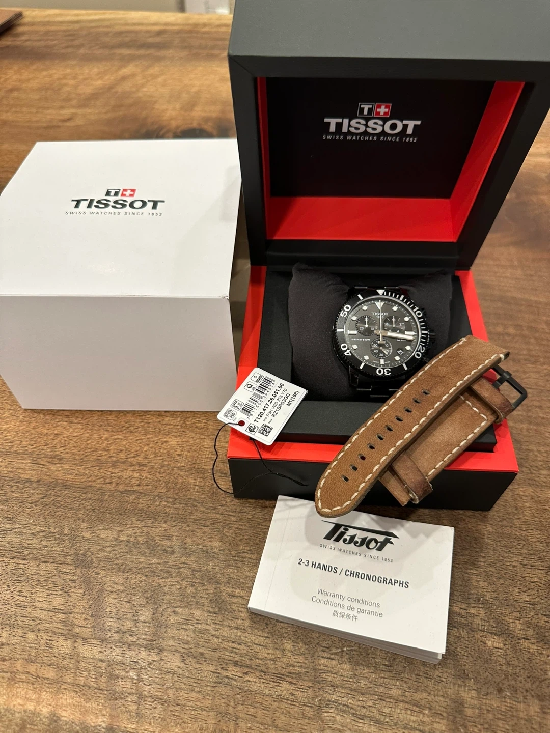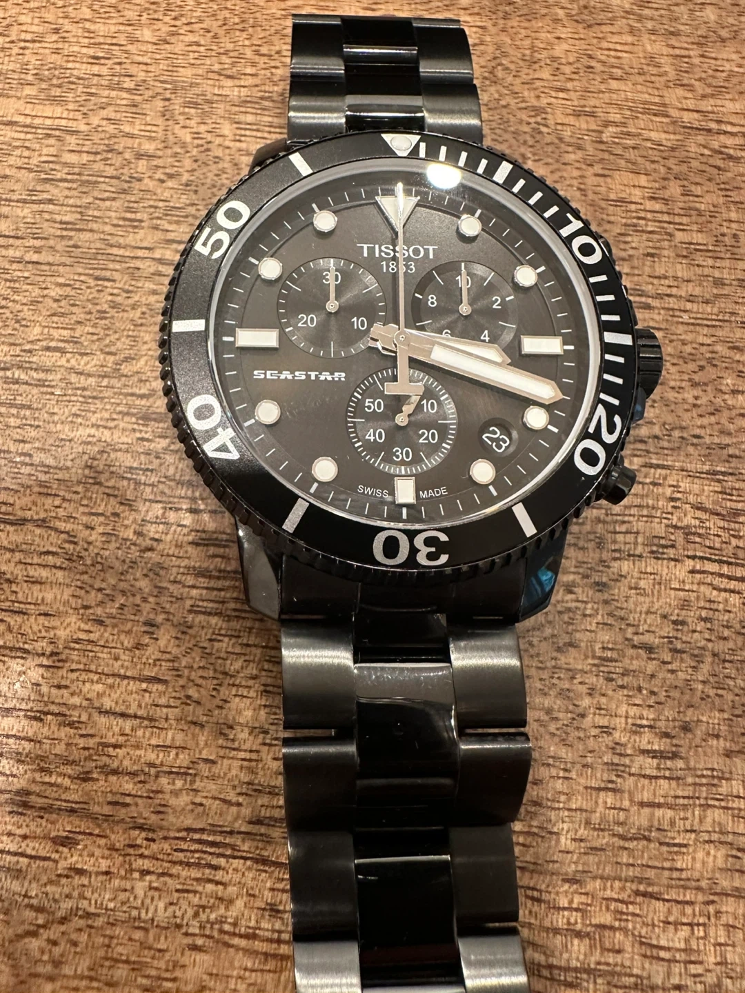 10Tissot 1000 Brand New Condition Got it as a gift. Not my style. Comes with a full kit. Original leather band, aftermarket stainless bracelet. Beautiful watch. * Model: Seastar 1000 Quartz Chronograph * Movement: Quartz * Case Material: Stainless Steel * Dial Colour: Black * Water Resistance: 300m * Size 45mm