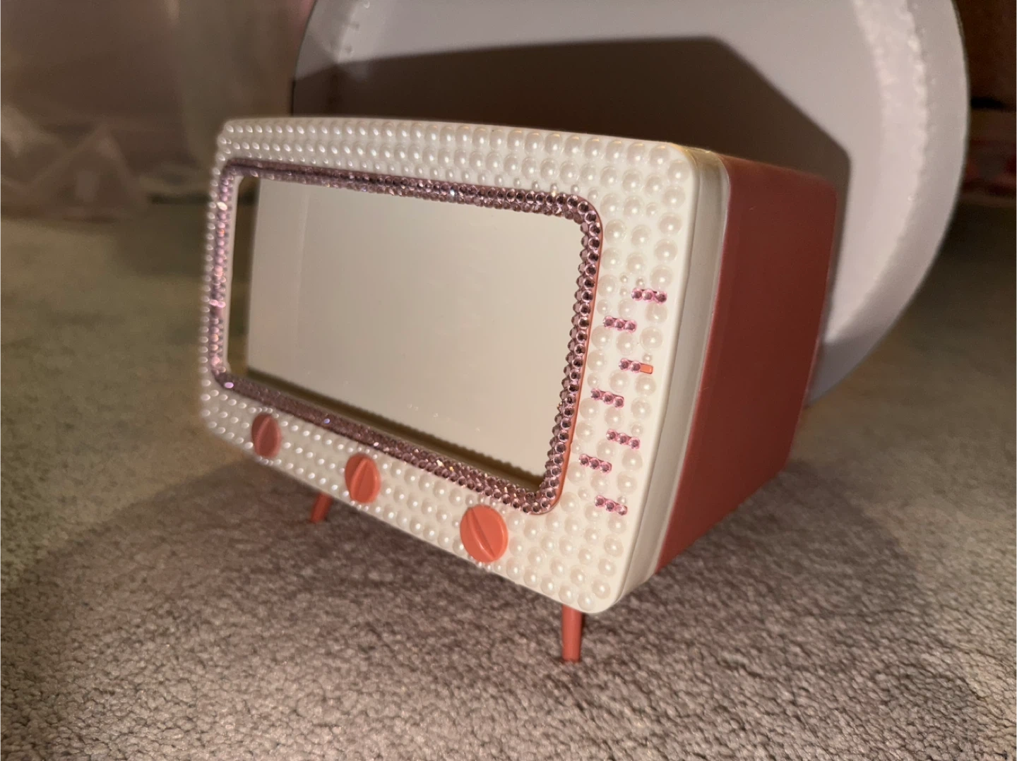 10Super cute retro TV-shaped phone stand+tissue box!It's decorated with pearls and pink rhinestones. Perfect for adding a touch of vintage charm to your desk or nightstand