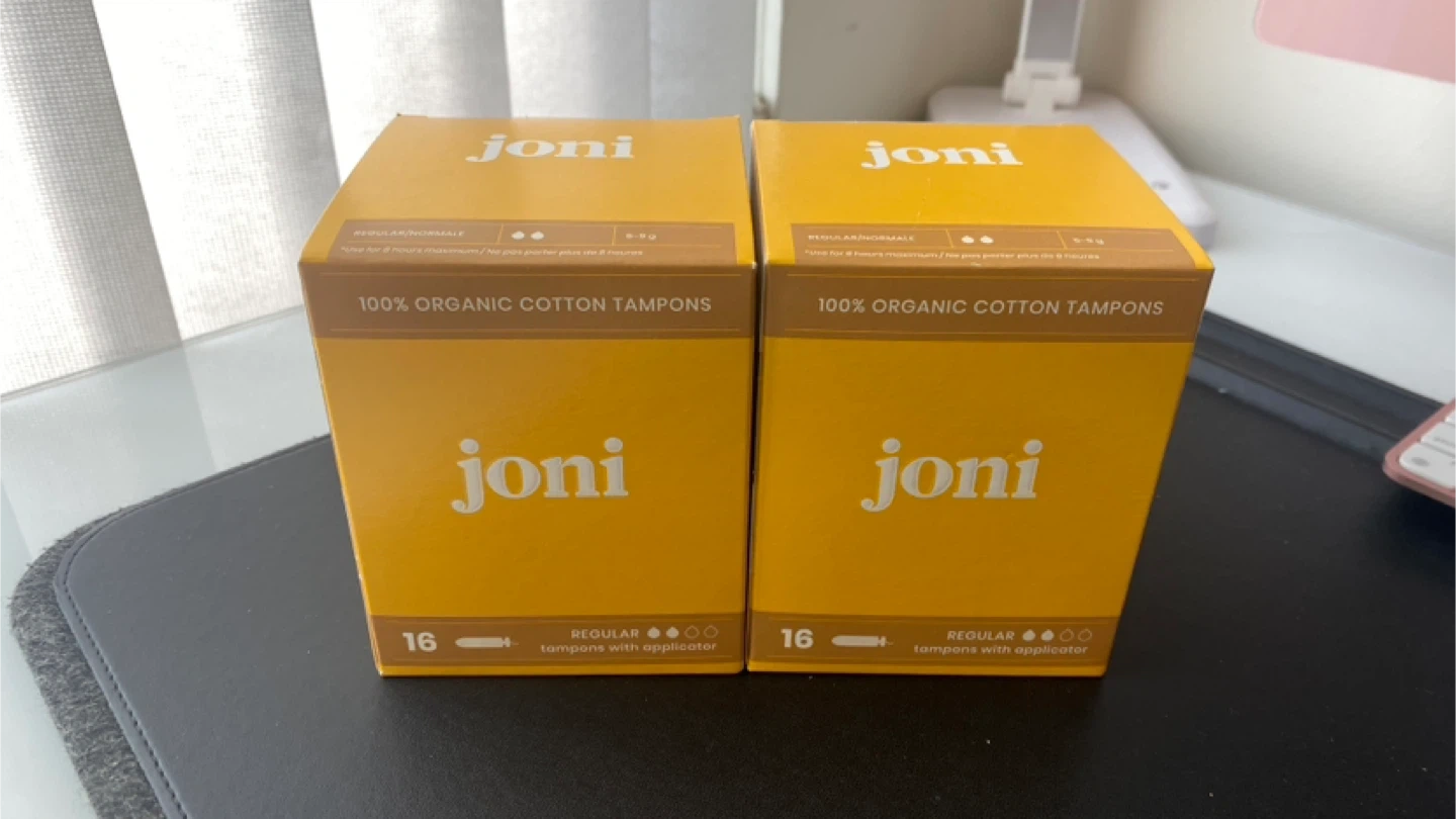 Joni 100% organic cotton tampons come with a recyclable applicator. These regular tampons are designed for up to 8 hours of protection. Two boxes included, each containing 16 tampons.