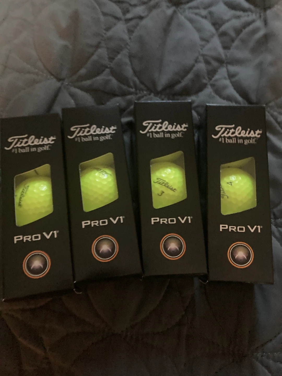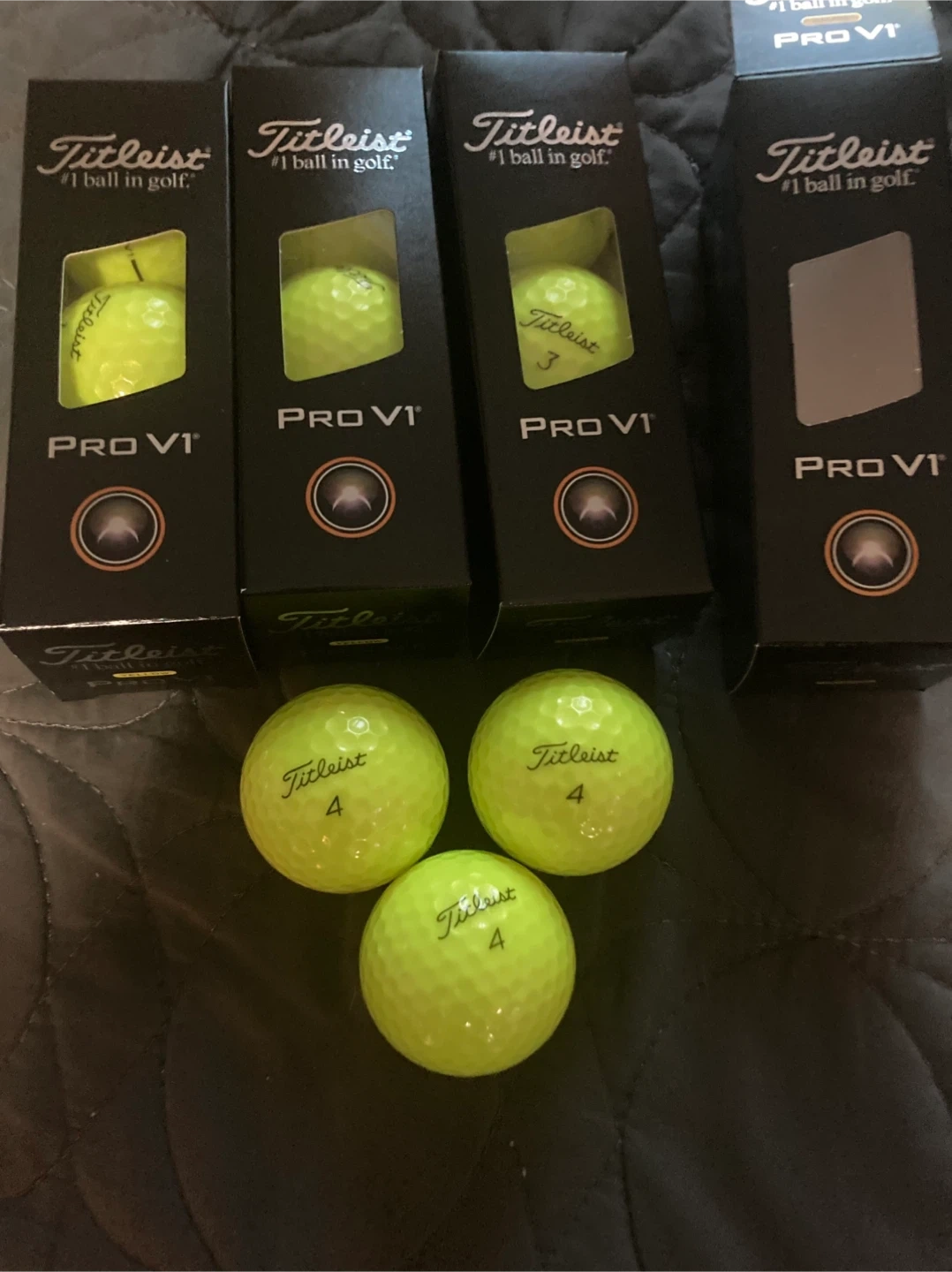 A dozen brand new never been used at all Titleist Pro V1 golf balls that are yellow. These balls are $75 plus tax in stores but only asking $50 firm