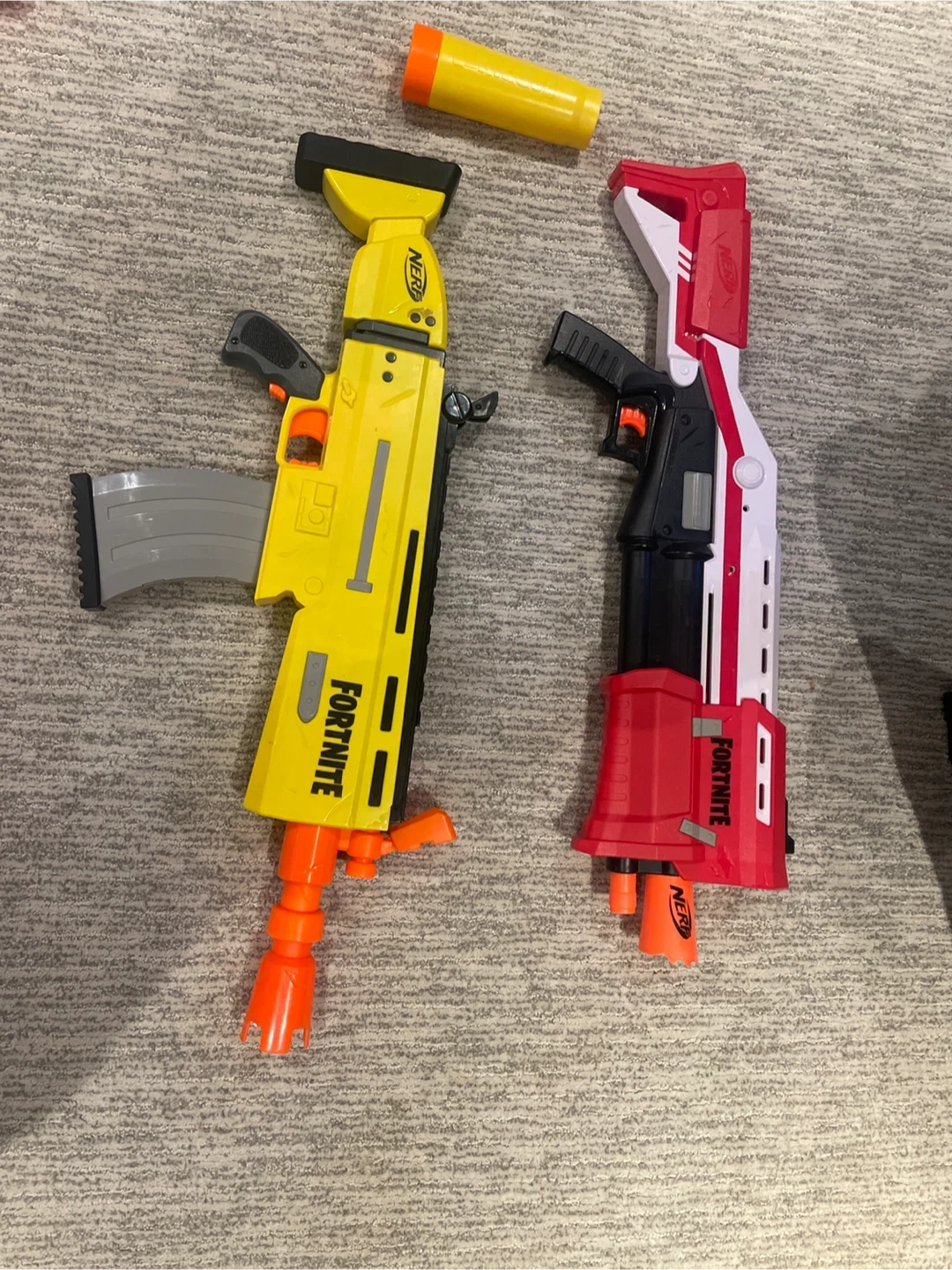 Two Nerf blasters from the Fortnite collection, including the AR-L and TS-R models. Both are in good condition and ready for play. These blasters are designed for fun and active play.