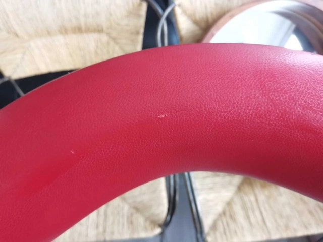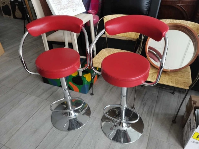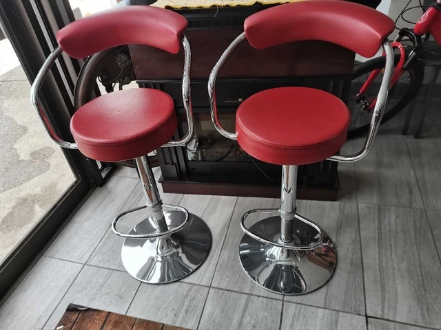 Set of 2 used bar stools, perfect for adding a pop of colour to your kitchen or bar area. These stools feature a vibrant red seat and backrest, complemented by a sleek, chrome-finished base and armrests, offering both style and comfort. The height is adjustable. Please see the images for details on their condition.