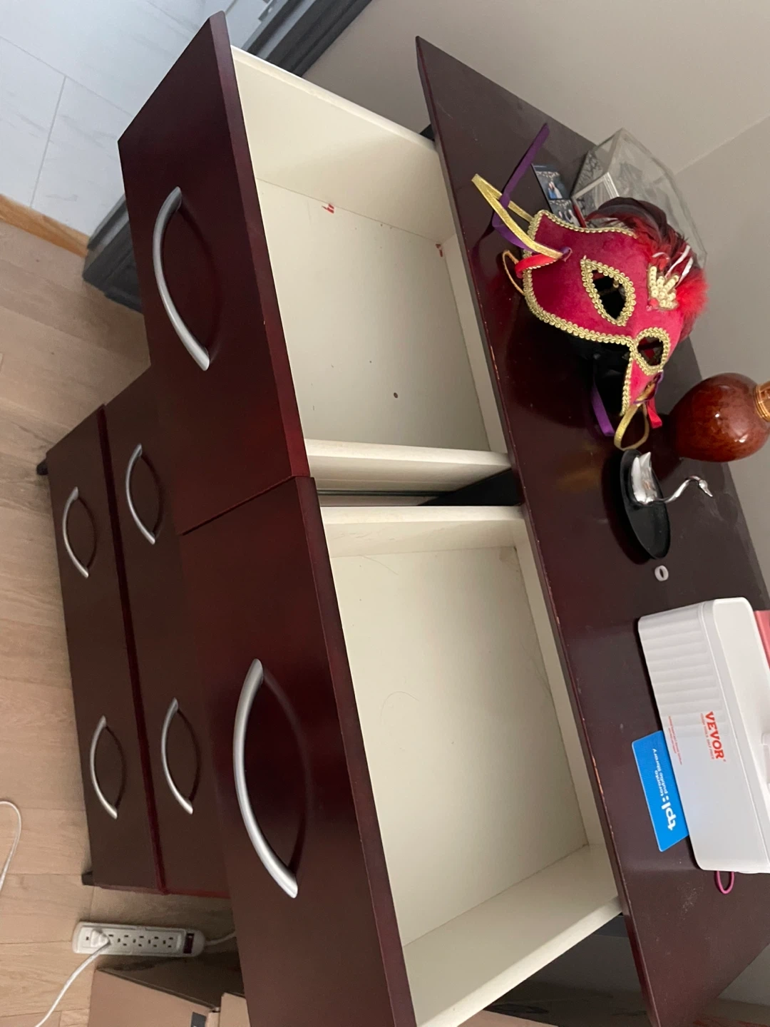 Dark cherry finish dresser with six drawers. Each drawer has a sleek silver handle. Offers ample storage space for your belongings.