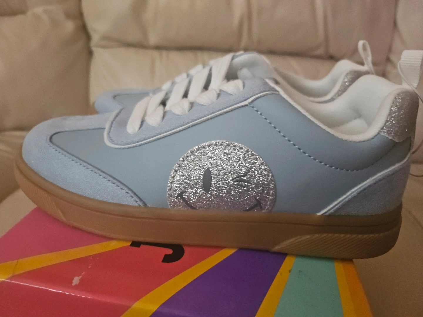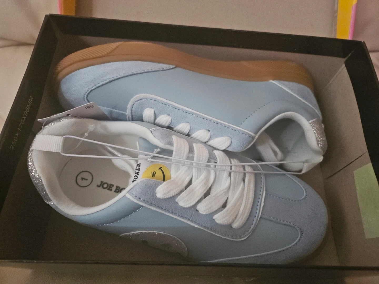 Girls Joe Boxer kids' sneakers in a light blue color. These shoes feature a fun smiley face emblem and a classic . Size 1