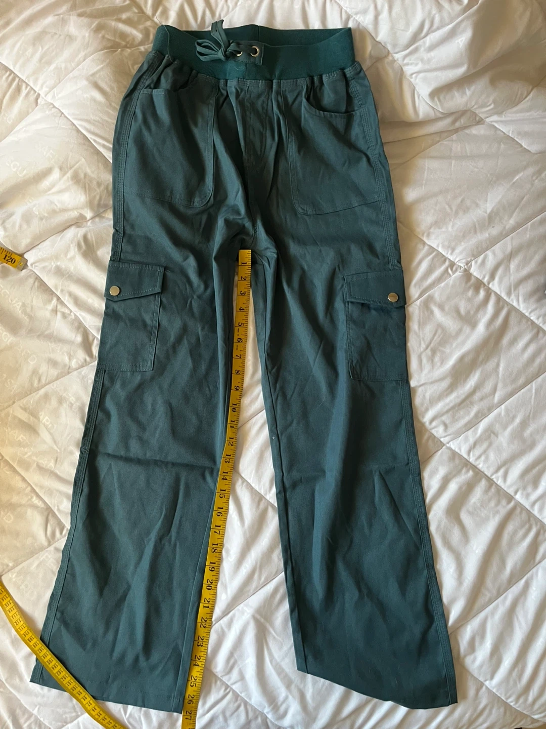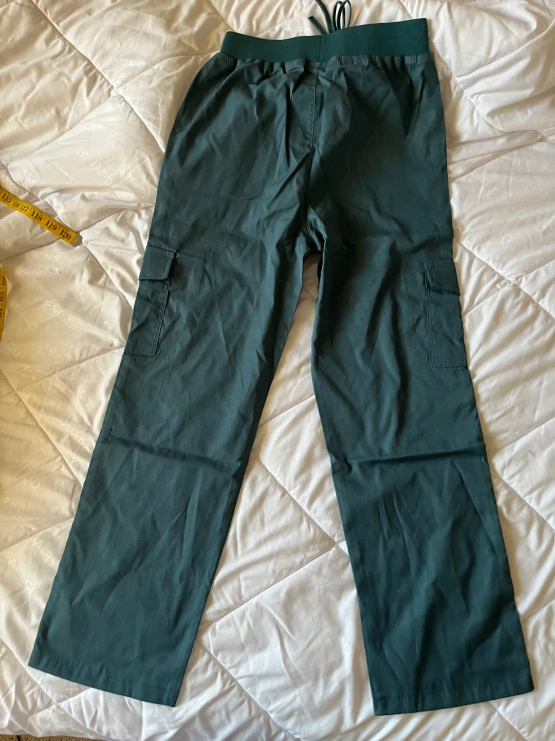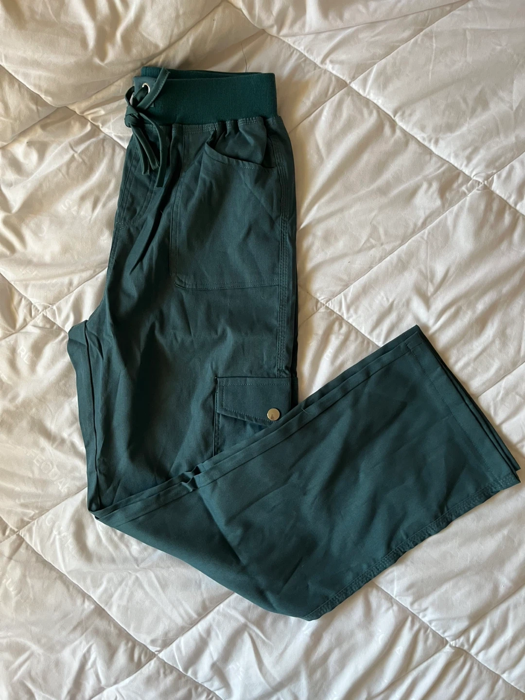 These teal cargo (scrub) pants have a comfortable elastic waistband with a faux drawstring.