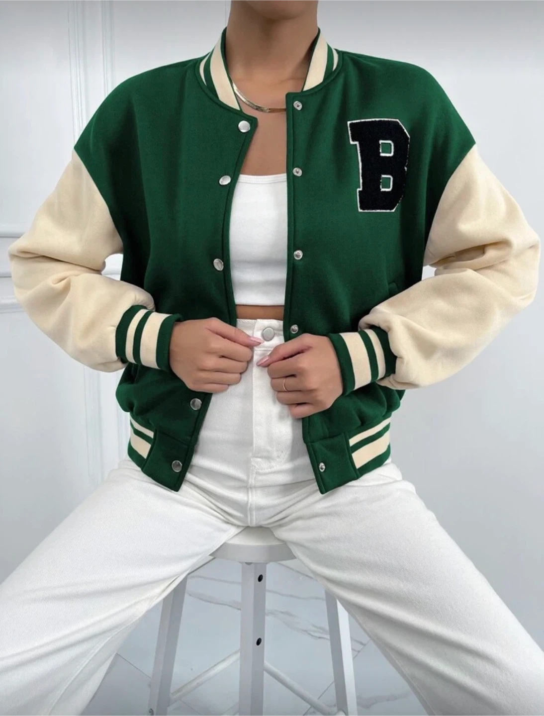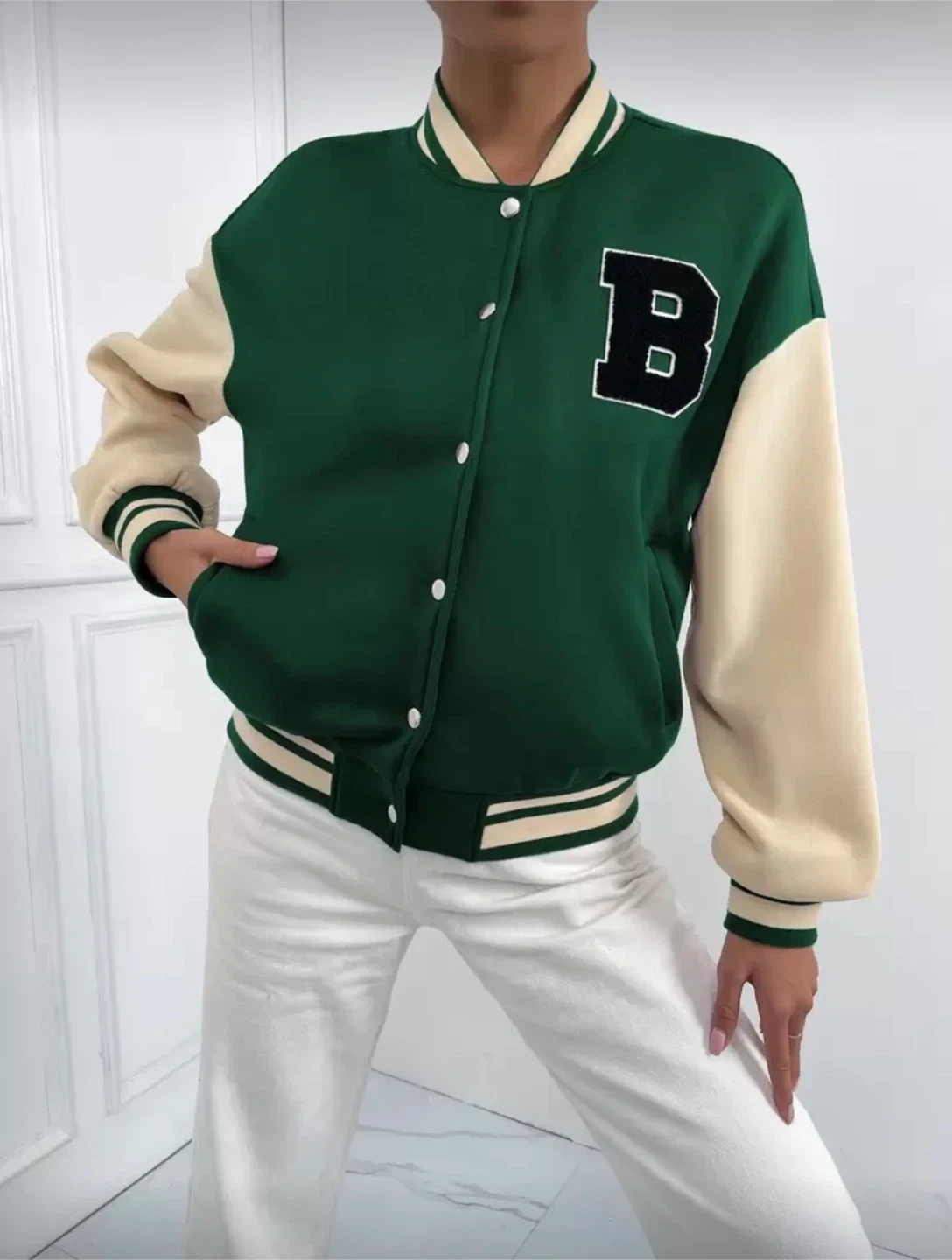 Classic varsity bomber jacket in green and cream with a black 'B' patch. It features a snap button closure and striped ribbed cuffs and hem. This jacket's colour blocking makes it a stylish layering piece.