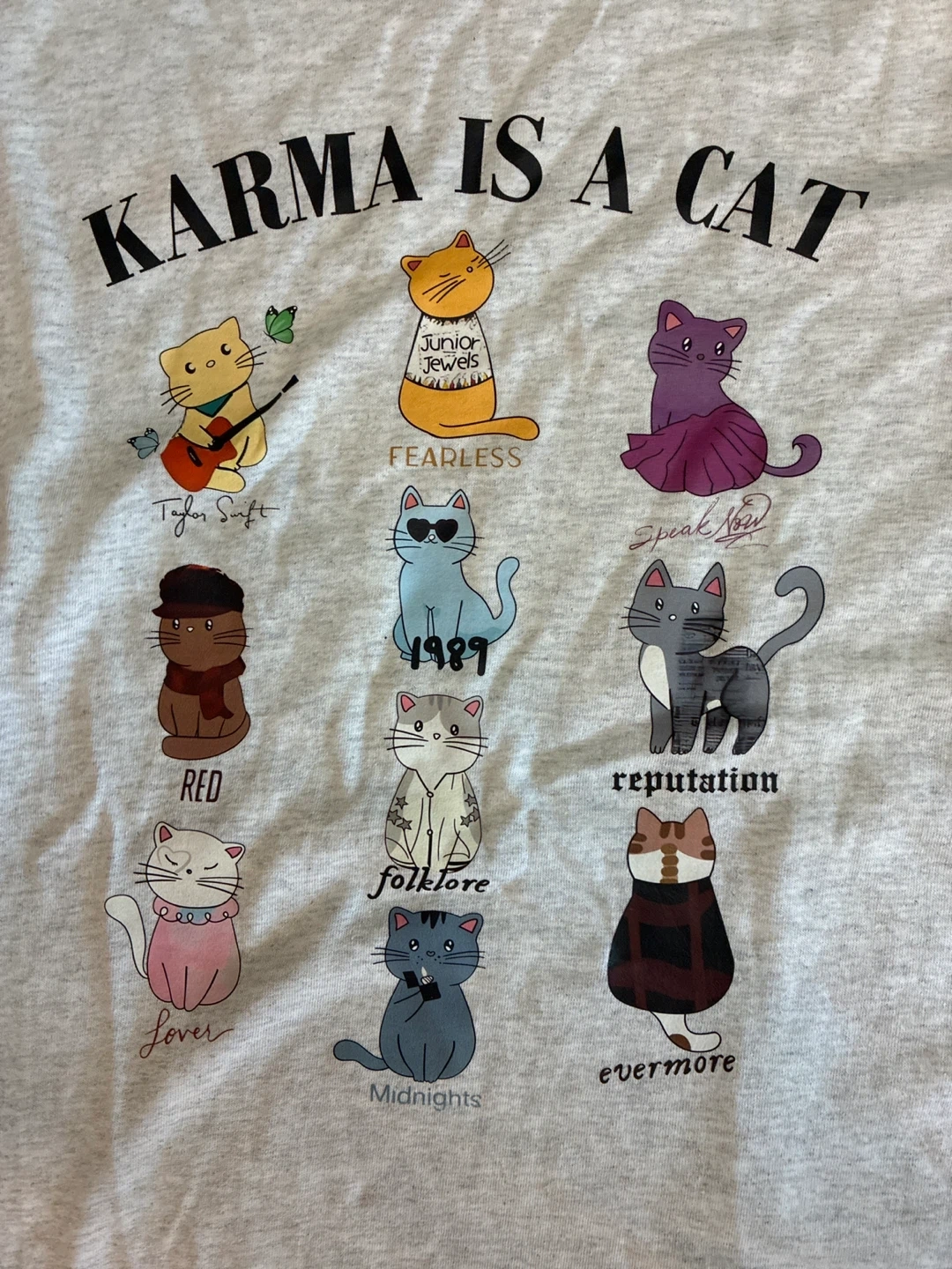 Grey t-shirt featuring "Karma is a Cat" graphic with 10 different cat illustrations representing Taylor Swift albums. Cotton blend material. Crew neck, short sleeves.