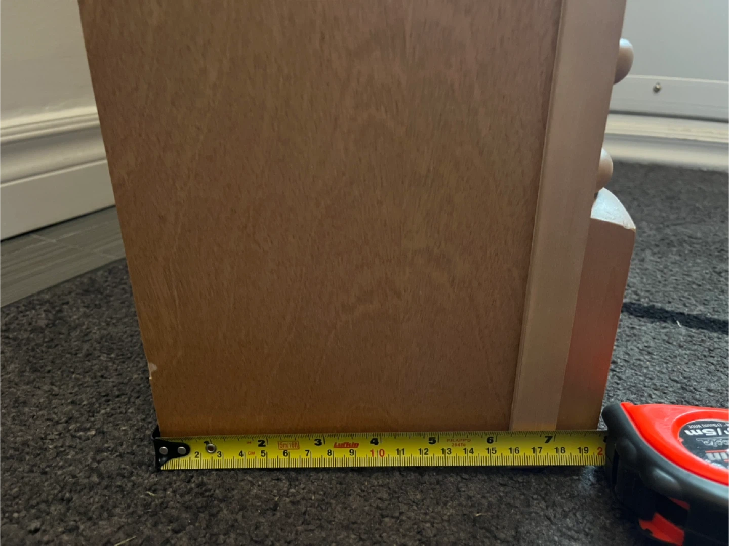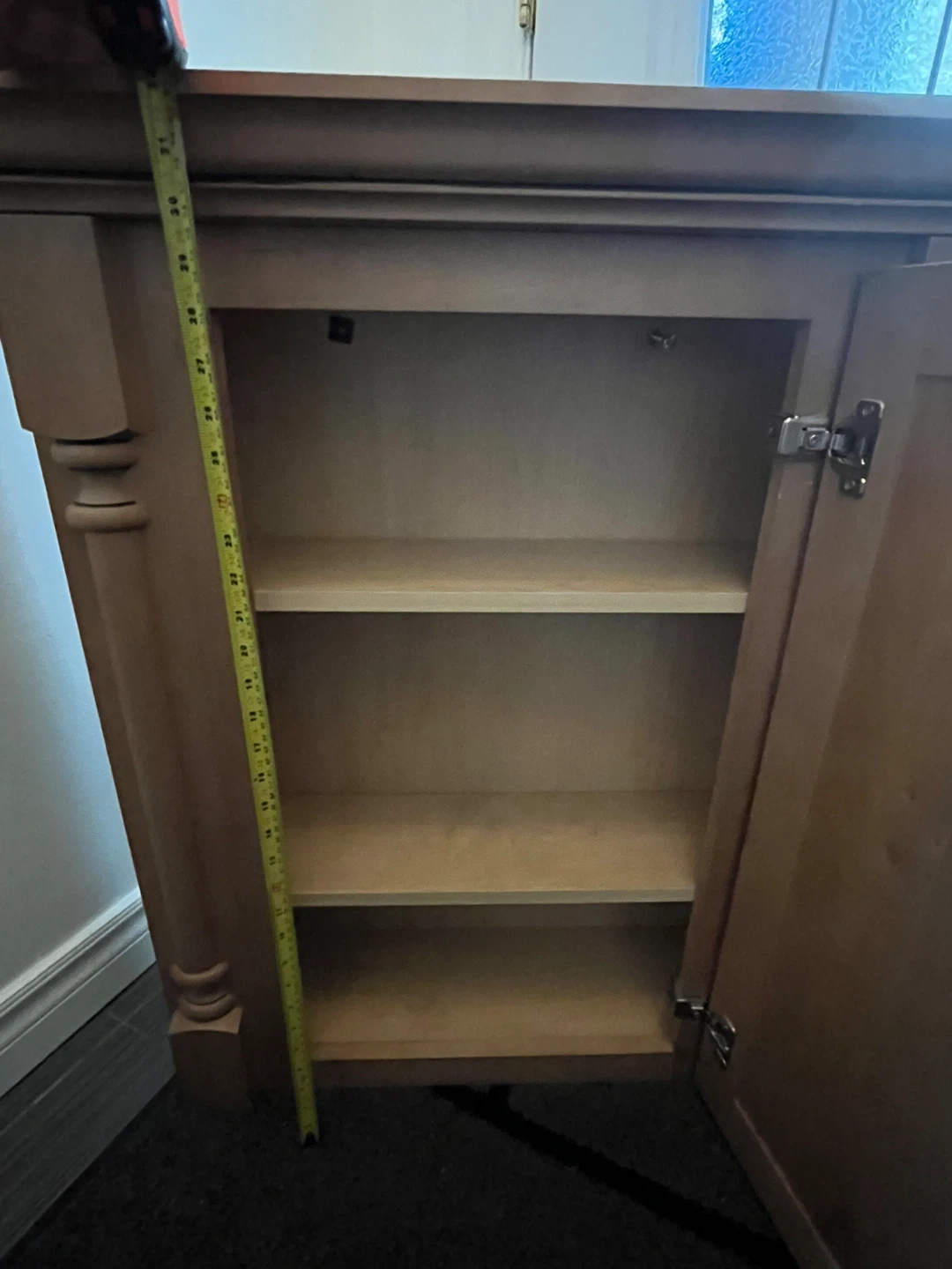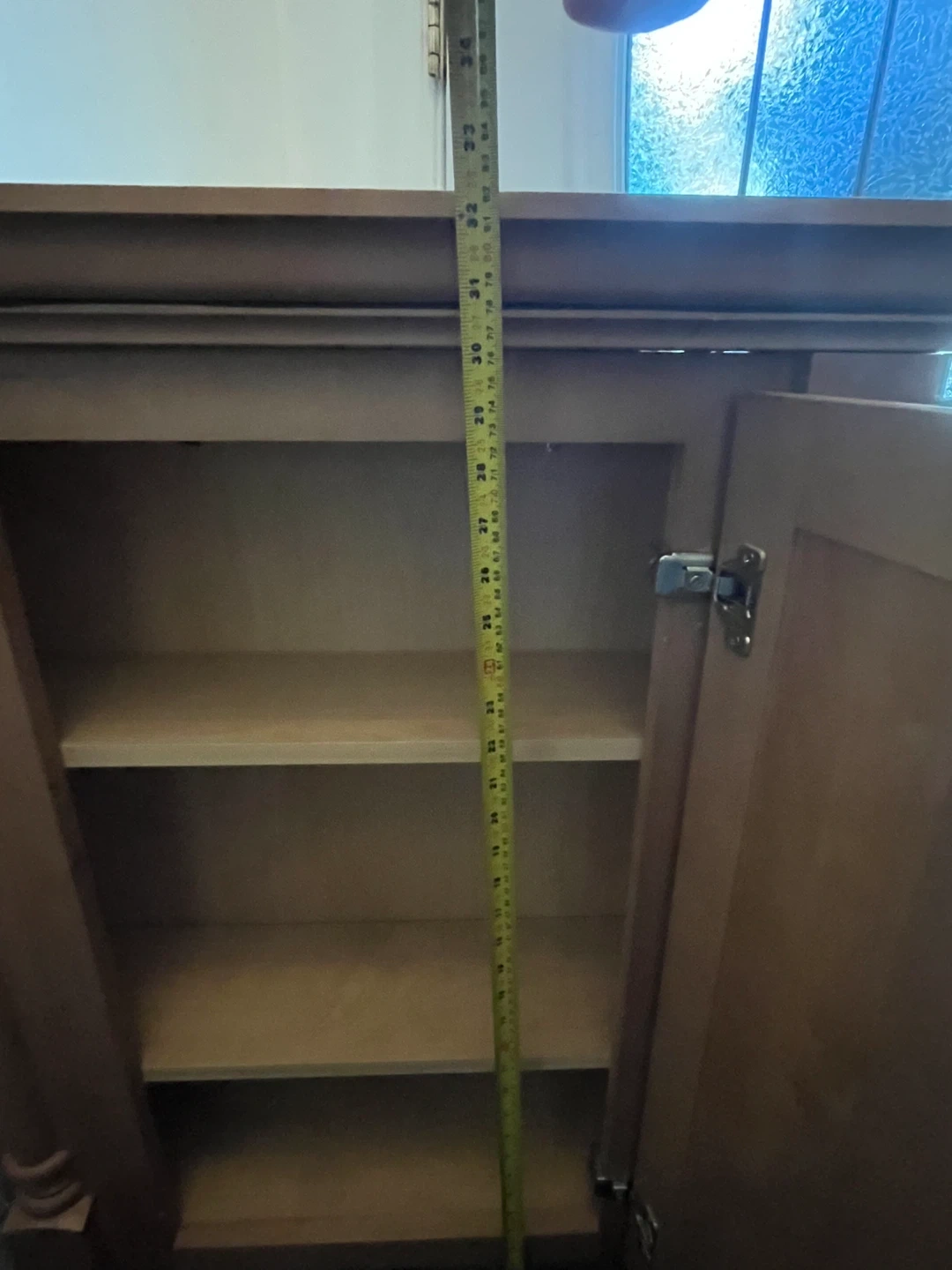Light brown High Quality Real wood storage / Pharmacy / Bathroom cabinet with decorative trim. It has three shelves inside. Approximate dimensions are 25" W x 21" D x 25" H.
