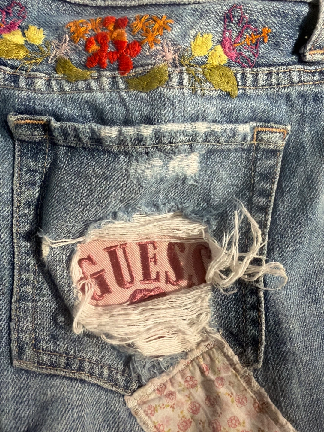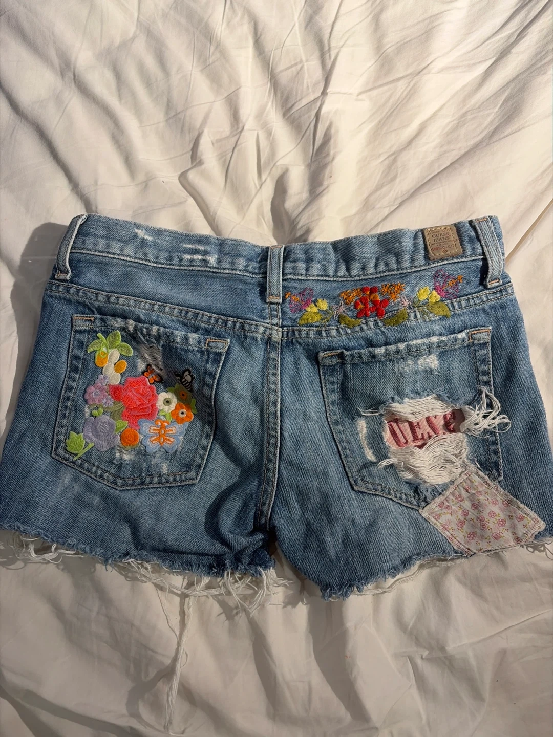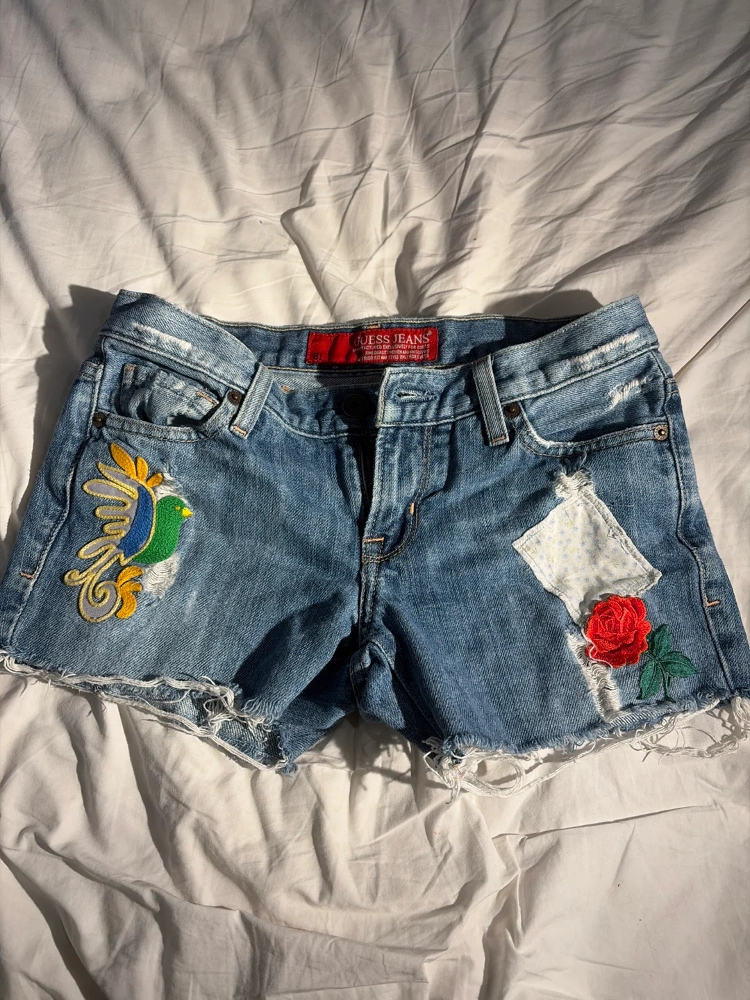 Cute Guess Jeans denim shorts with floral and bird embroidery. Distressed design with patches and rips. Waist size 26. They're vintage from sometime around the early 2000s maybe even late 1900s. They're superr cute and I would keep them for myself. They just don't fit me.π. they're an amazing condition and I've never worn them out but I know that they belonged to my mom. feel free to message me with any questions.π