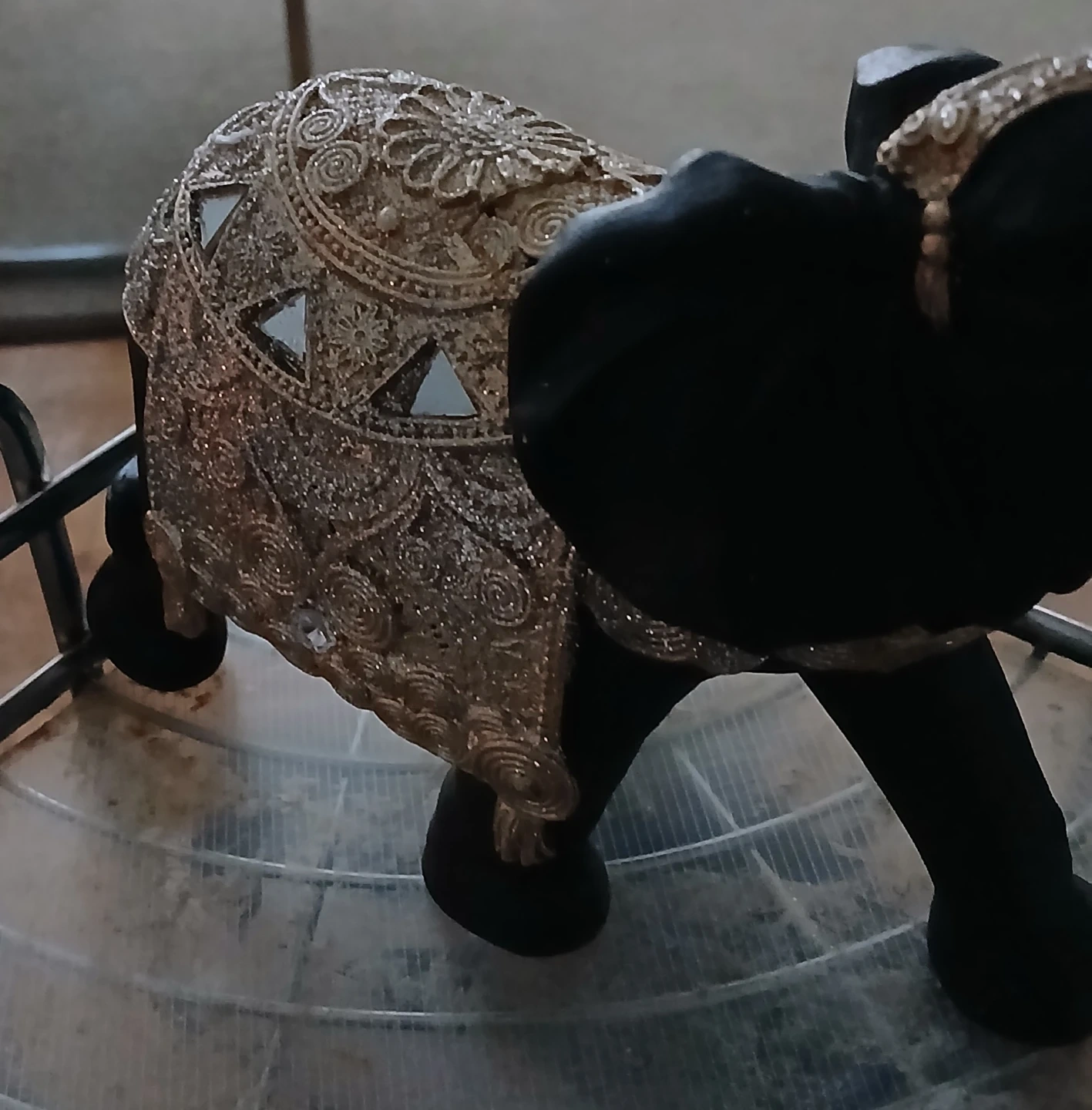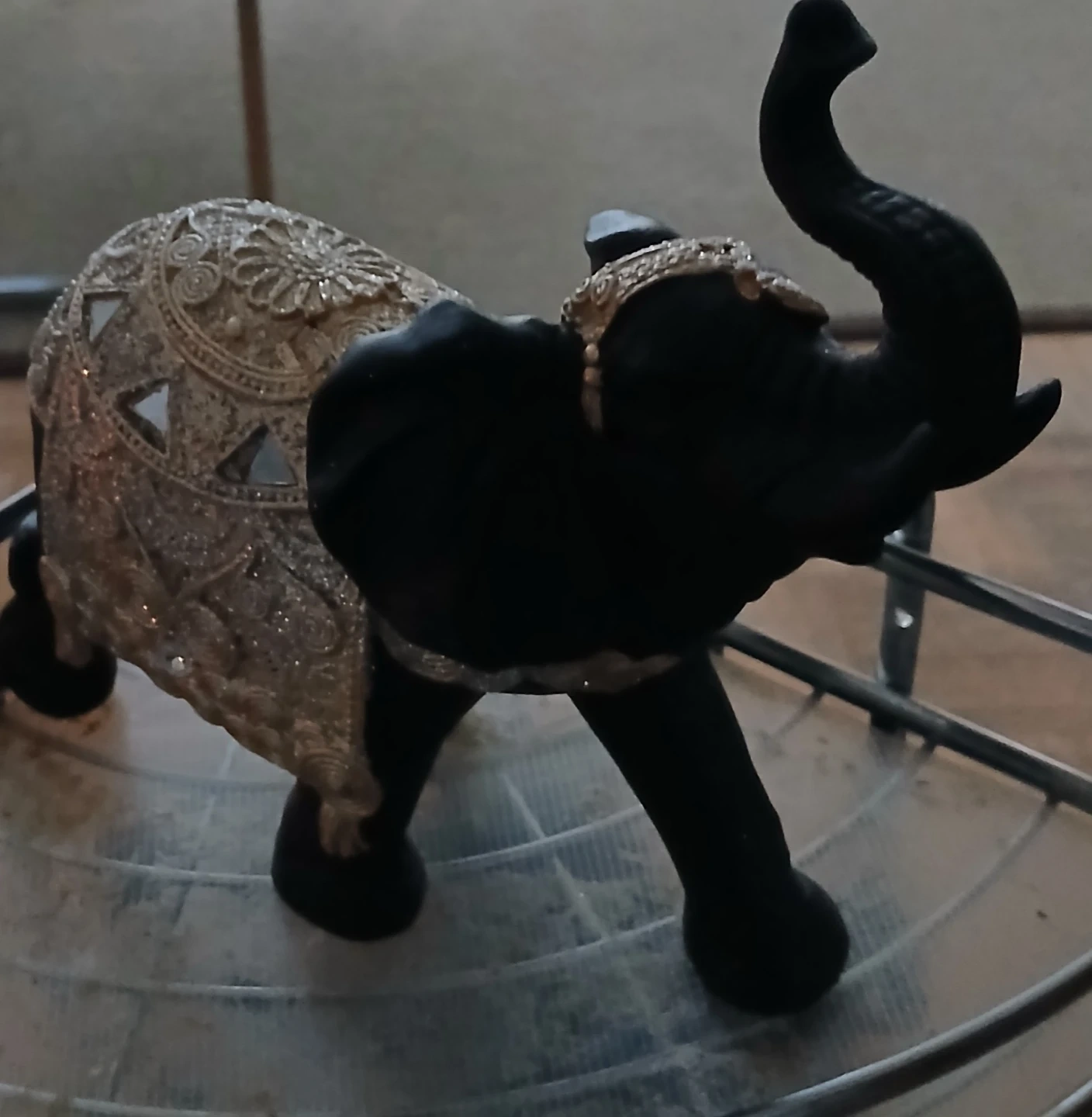 This decorative elephant figurine is a striking accent piece. It's made of dark material, possibly resin or wood, and adorned with ornate gold-toned decorative fabric and mirrored accents on its back and head. It stands with its trunk raised, showcasing intricate detailing.