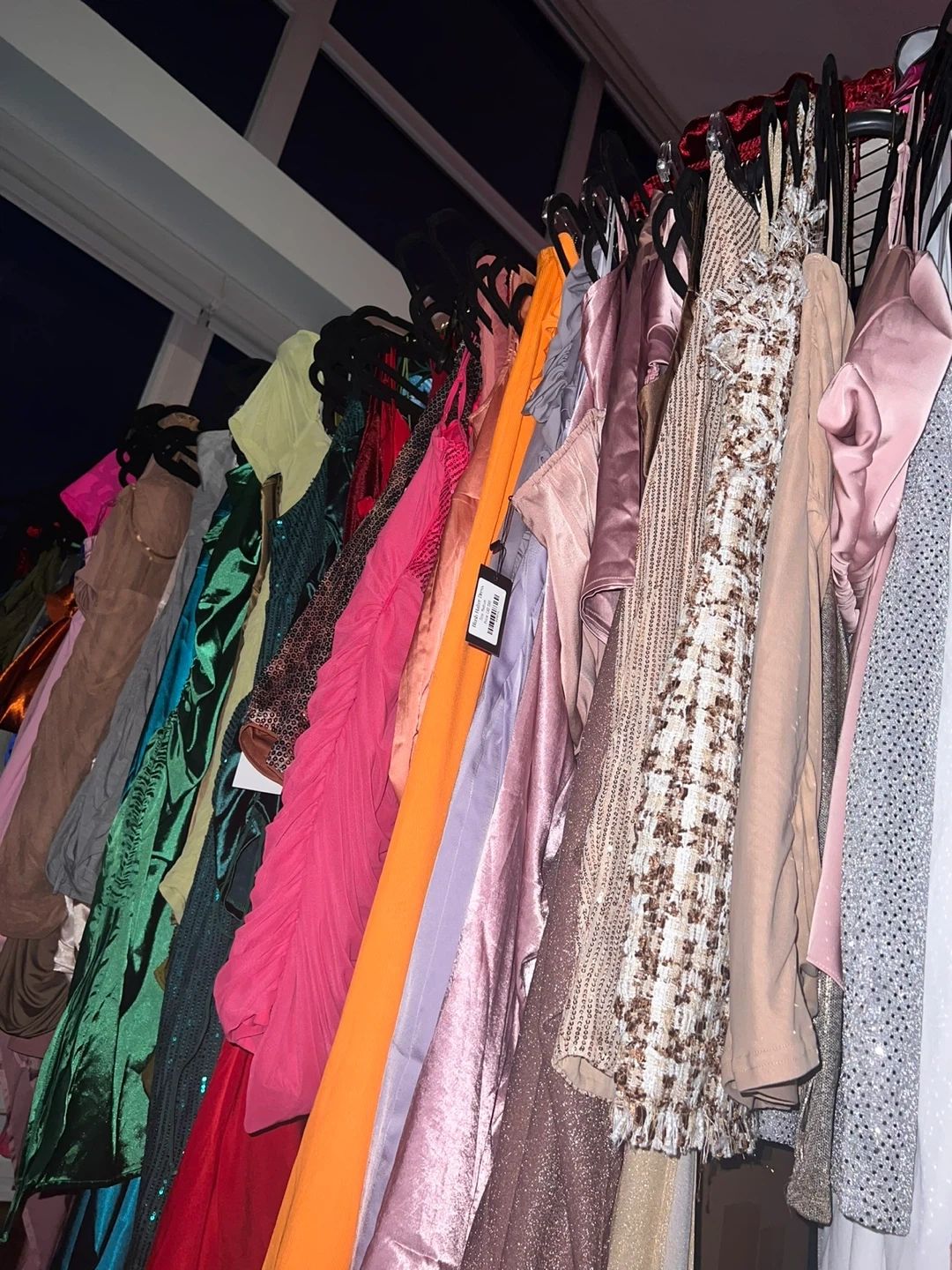 A collection of vibrant and elegant dresses in various styles and colours. These dresses are perfect for any special occasion or night out! Features include sequin embellishments, satin fabrics, and intricate detailing.