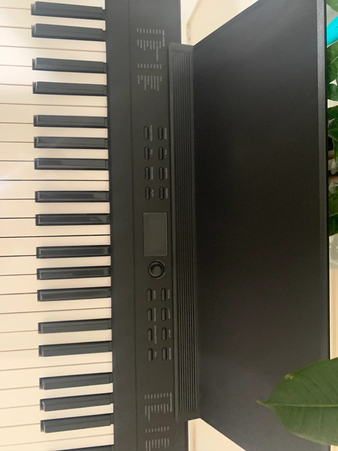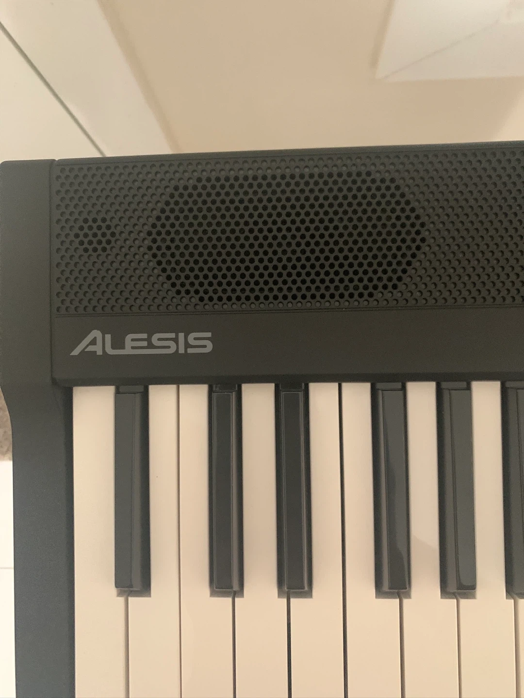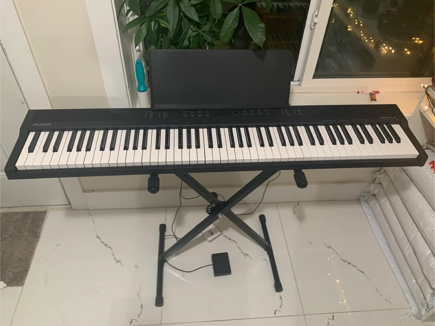 This Alesis Recital digital piano keyboard comes with 88 keys and a stand. It's perfect for learning to play or for practice sessions. The keyboard includes a sustain pedal.