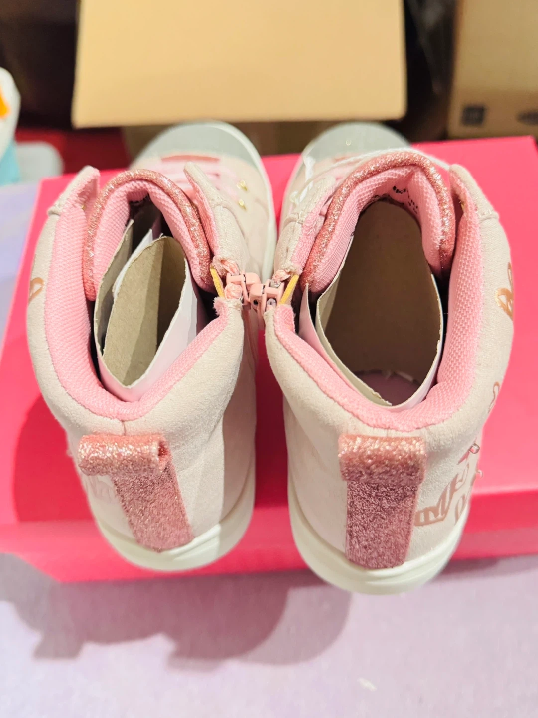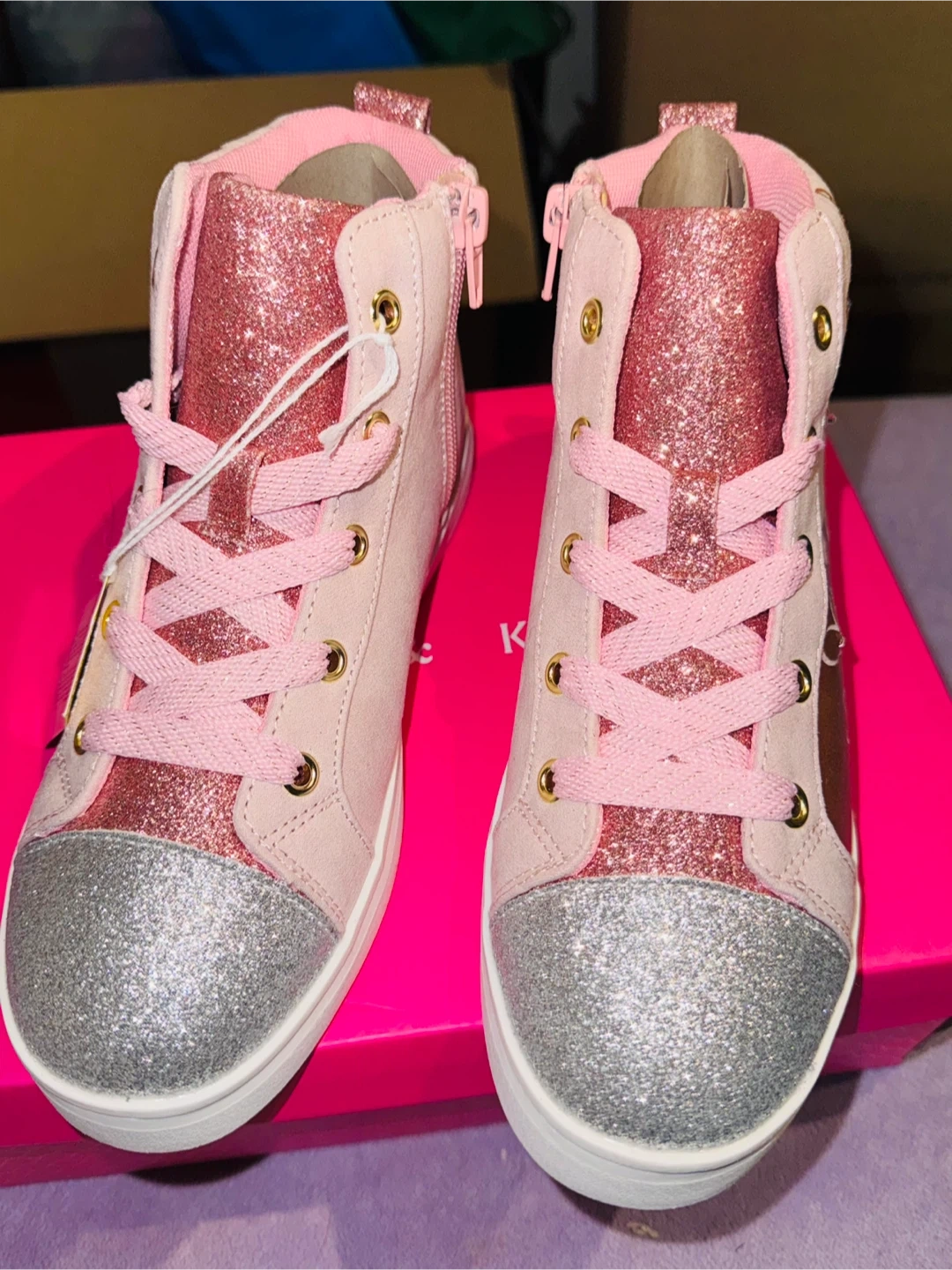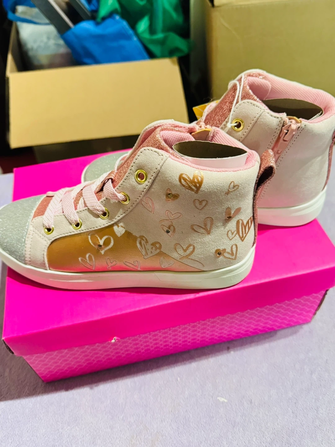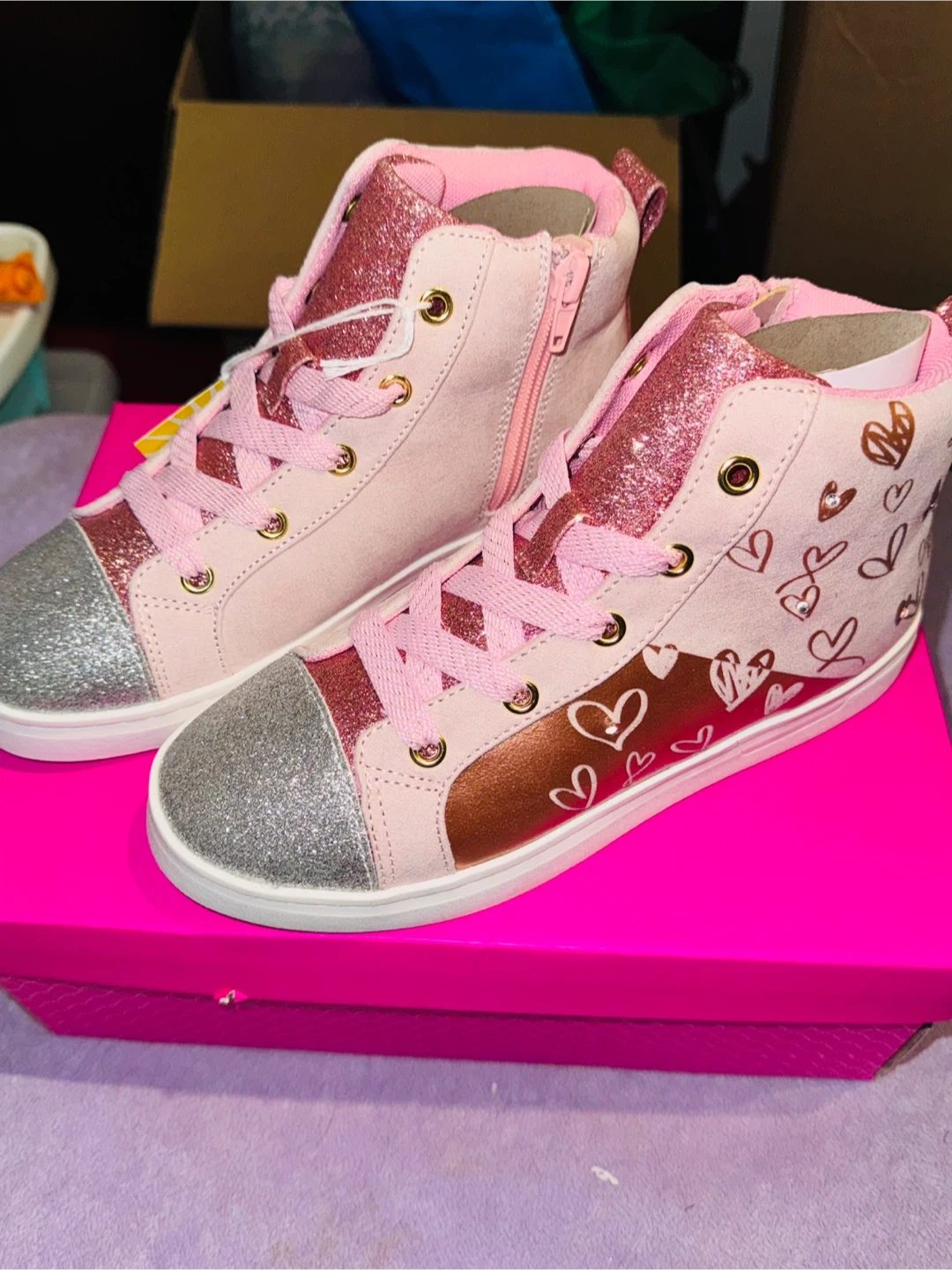 These adorable girls' high-top sneakers are brand new and come in their original box! They feature a lovely pink colour with glittery silver toes and fun heart designs. Perfect for adding a touch of sparkle to any outfit!