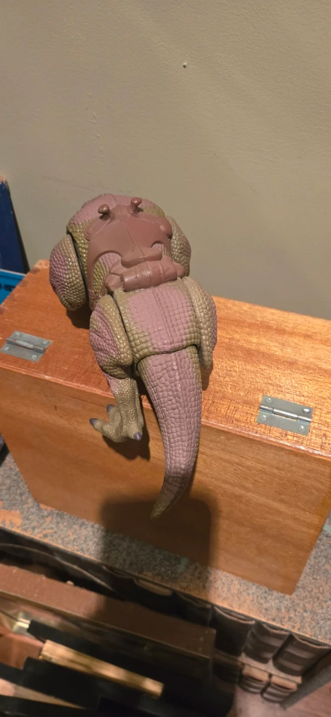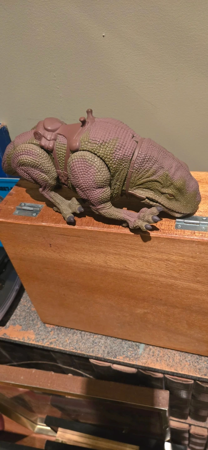 This is a dinosaur toy with a saddle. It's a plastic toy with textured skin details. The saddle is a separate piece that attaches to its back.