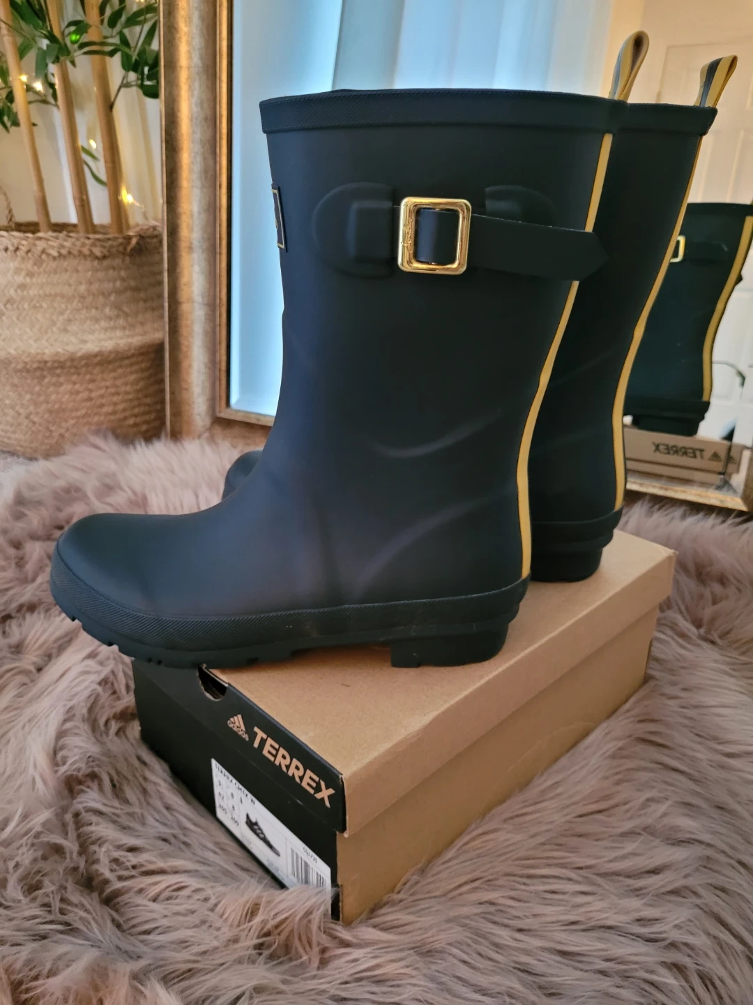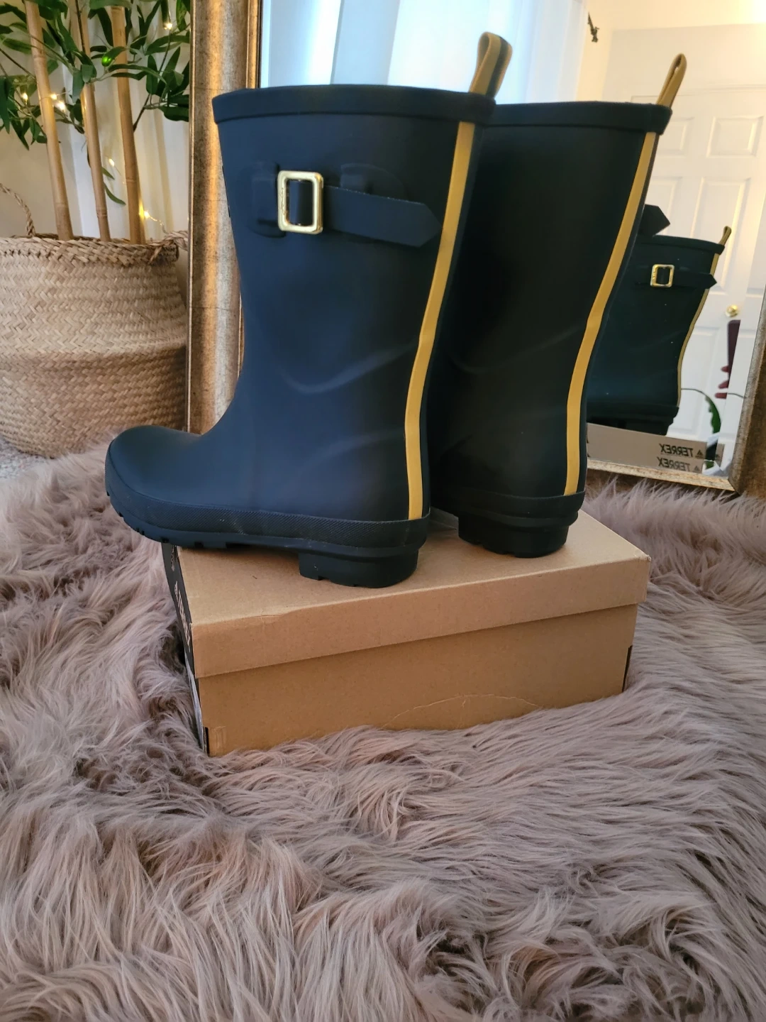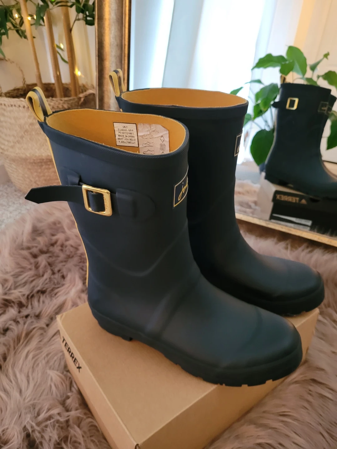 These women's tall rain boots are from Joules. They're navy with yellow trim and a side buckle accent. The boots are made of rubber for durability. They've only been worn a few times and are in very good condition.