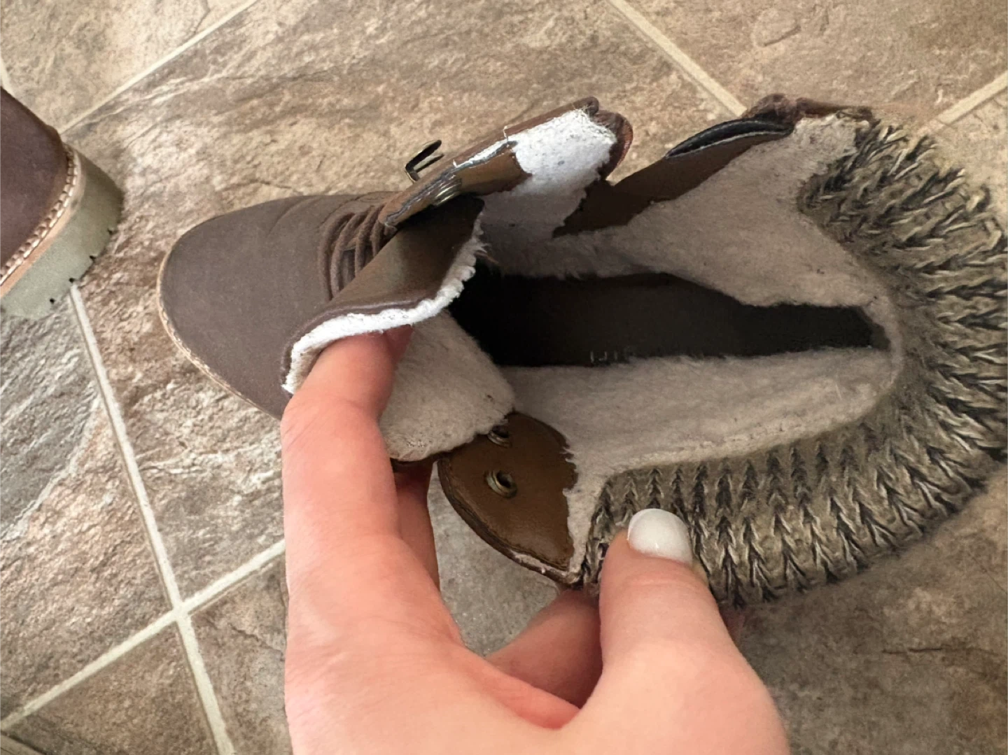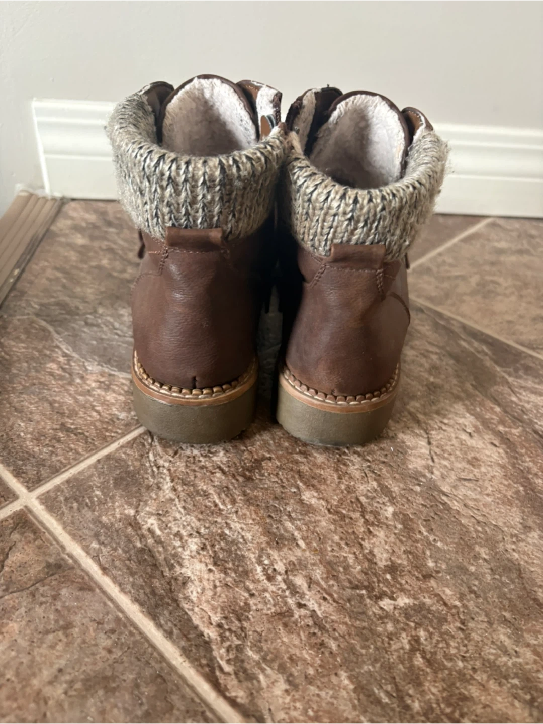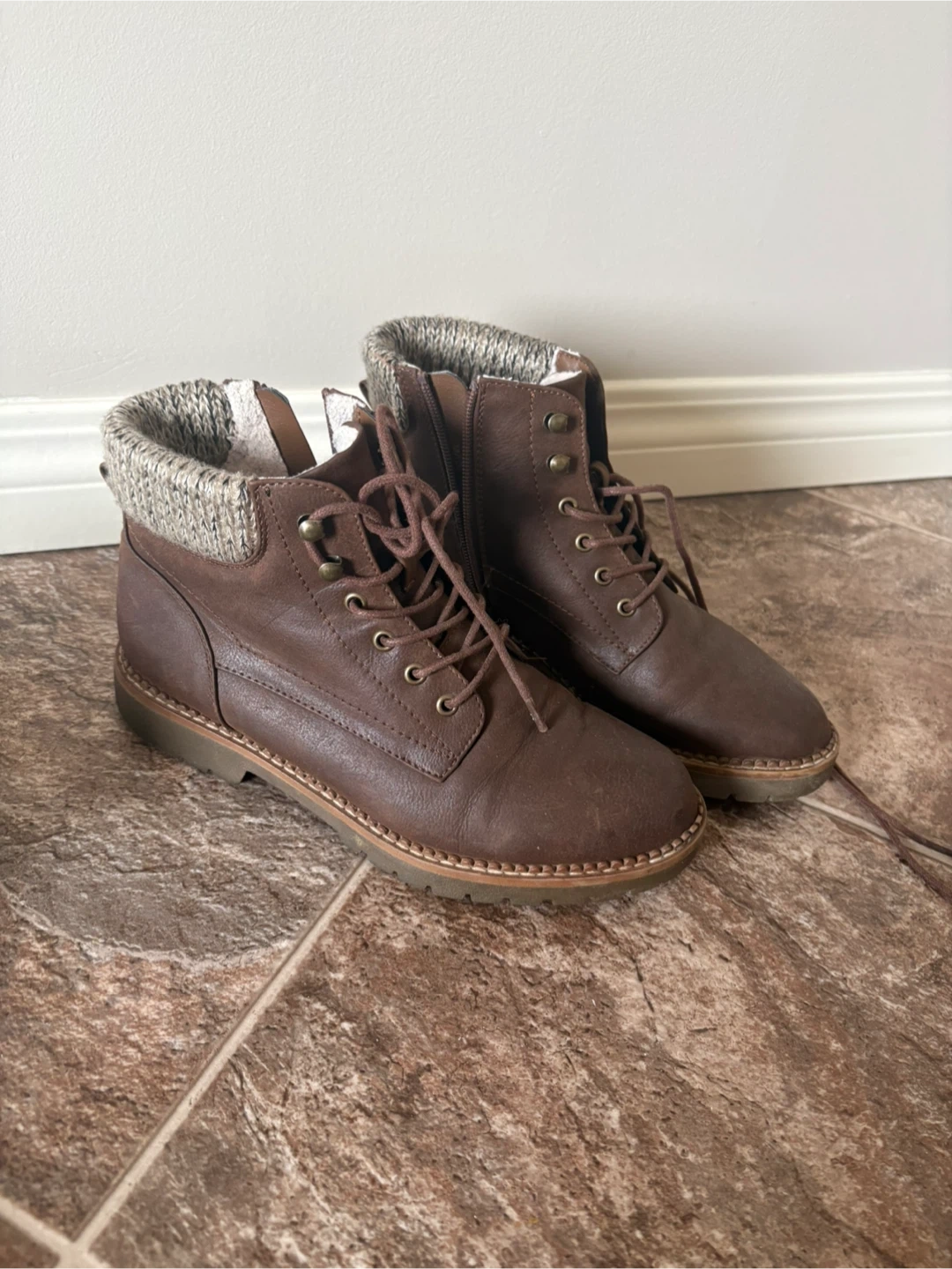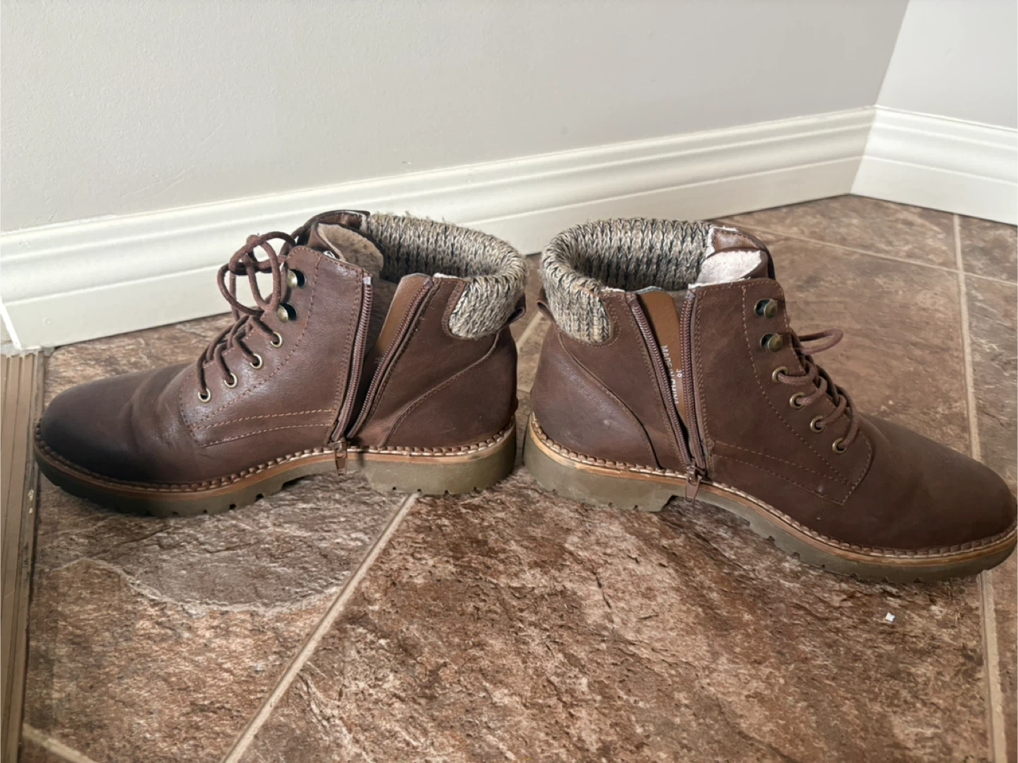 These stylish brown winter boots feature a cozy sherpa lining and a sweater cuff. They have both lace-up and side zip closures for easy on and off. Perfect for keeping your feet warm and dry during colder months!