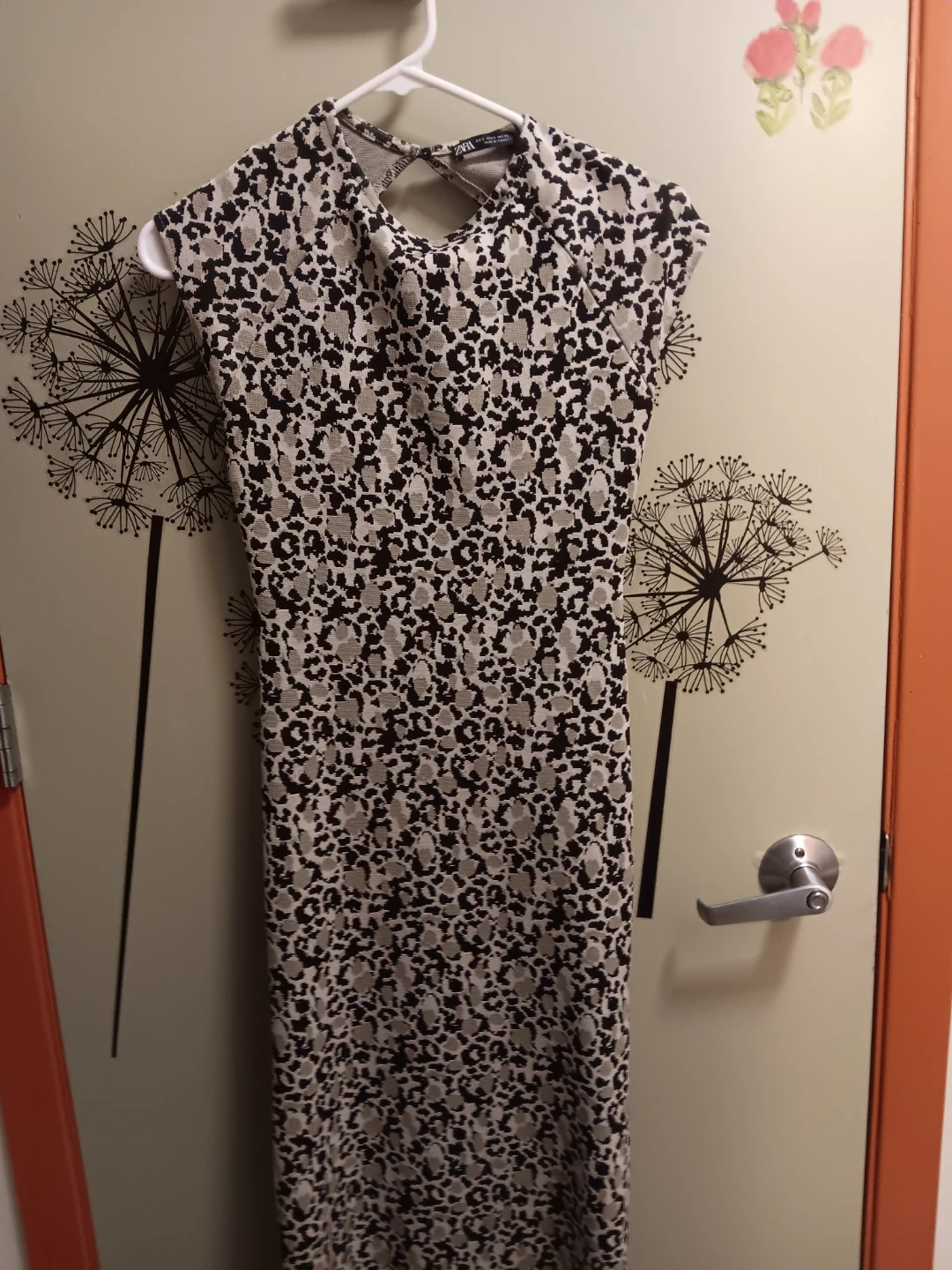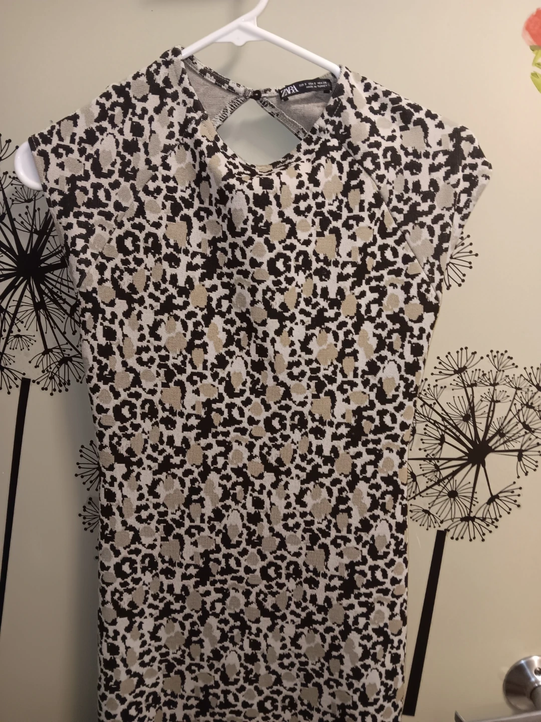 This is a ZARA cap sleeve top with a leopard print. It's a size small. The back features a cut-out detail. Beautiful, Super flattering and versatile dress@!