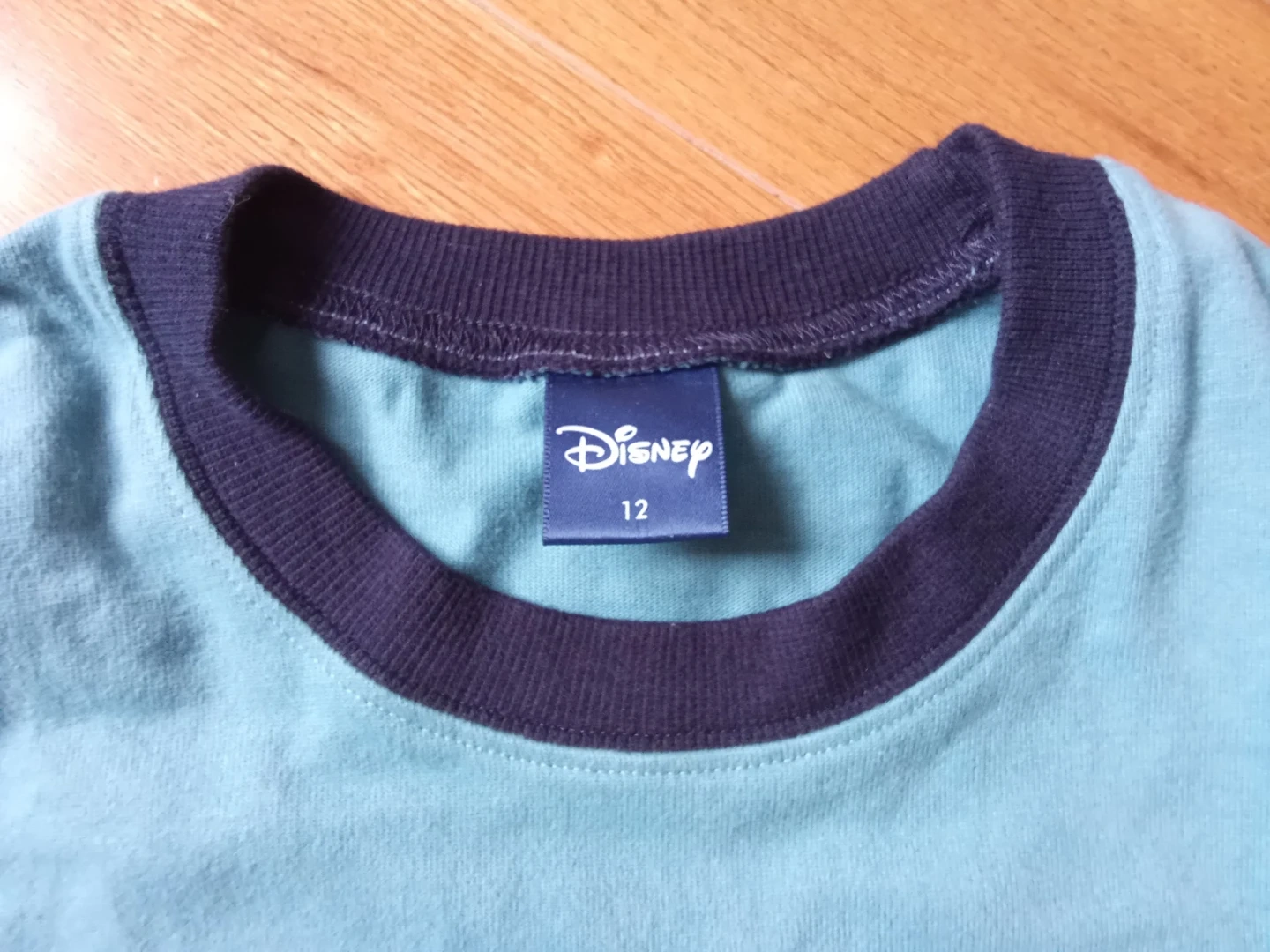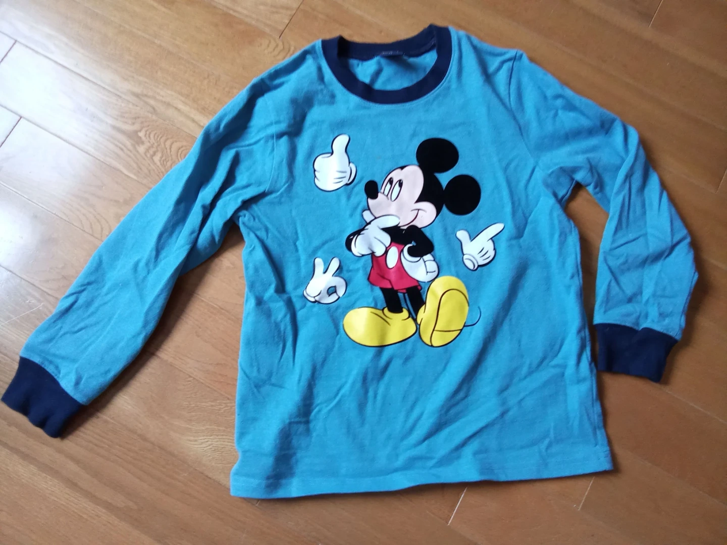 This is a Disney long-sleeved shirt featuring Mickey Mouse. It's blue with a navy trim and has a size tag indicating 12. The fabric is soft and comfortable for kids.