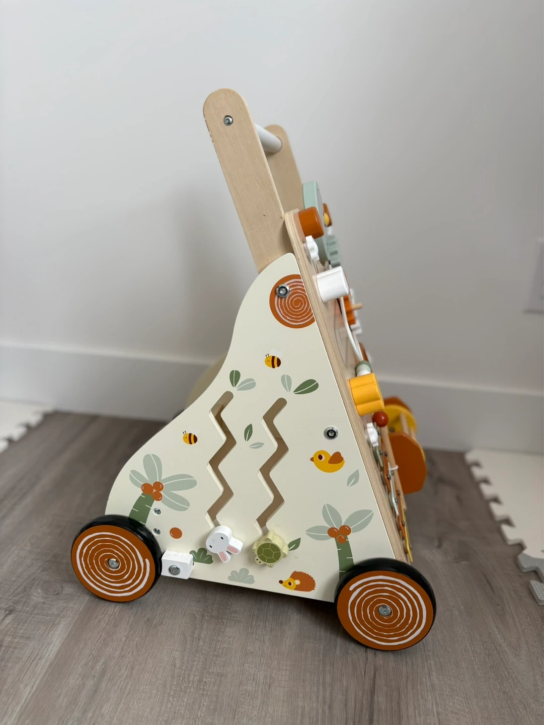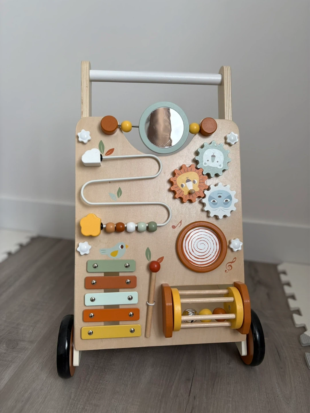 This wooden activity walker is packed with engaging features for little ones. It includes a xylophone, beads, gears, and a mirror. Designed for early learning and development.
