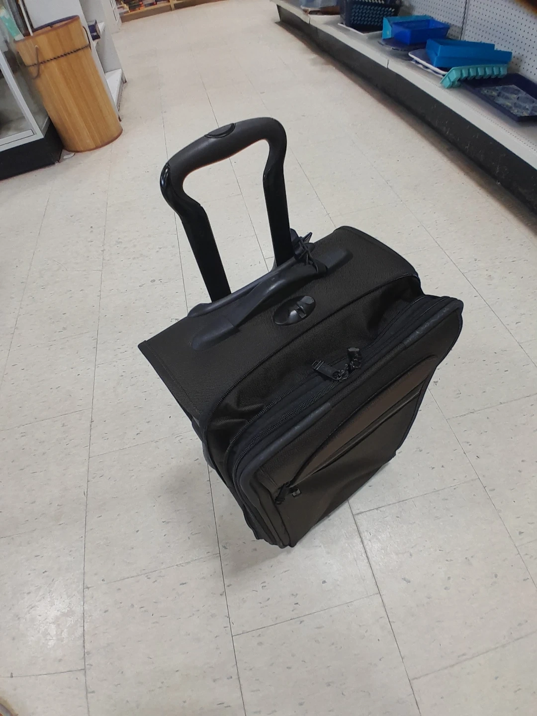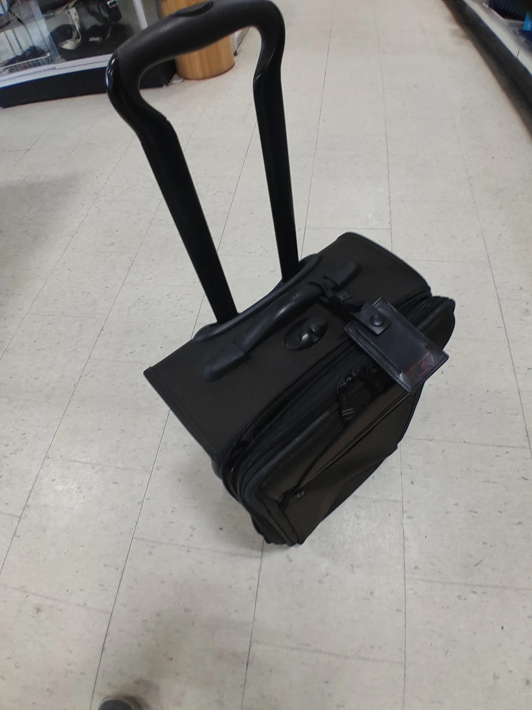 Tumi rolling suitcase. It's black with a telescopic handle and exterior pockets. Made from durable fabric