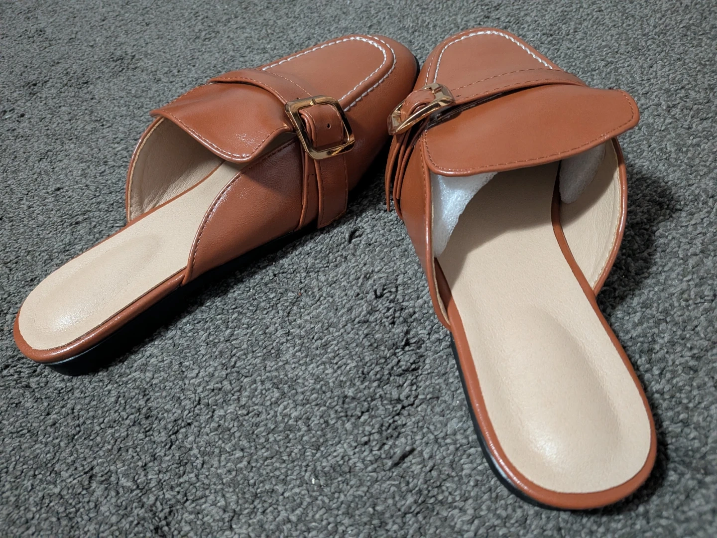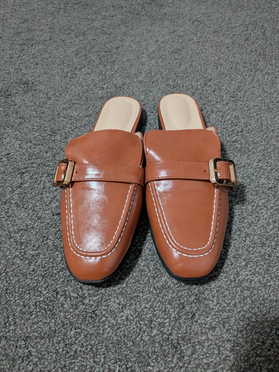 These stylish brown faux leather mules feature a classic loafer design with a decorative buckle. They're a slip-on style with a comfortable fit. Includes original box and dust bag.
