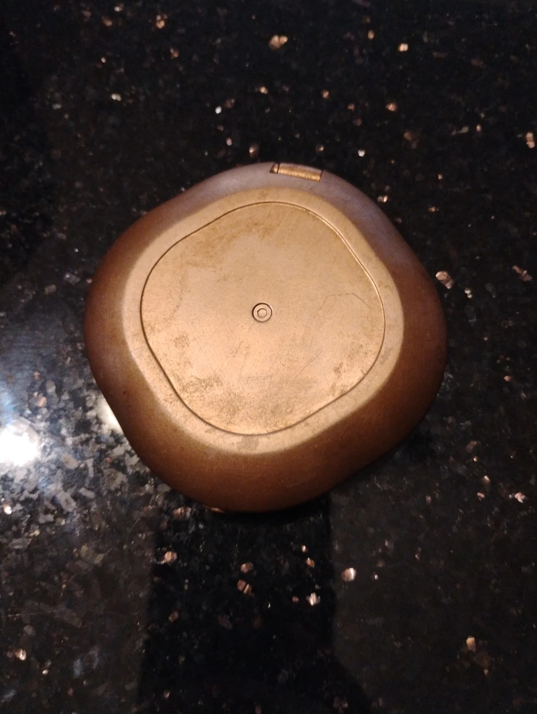 Movie set Prop. Painted compact mirror with a unique 4 quadrant compartment. It features a faux green leather accent on the lid and has compartments inside. Mirror is included and intact. The hinge works well and is magnetic.