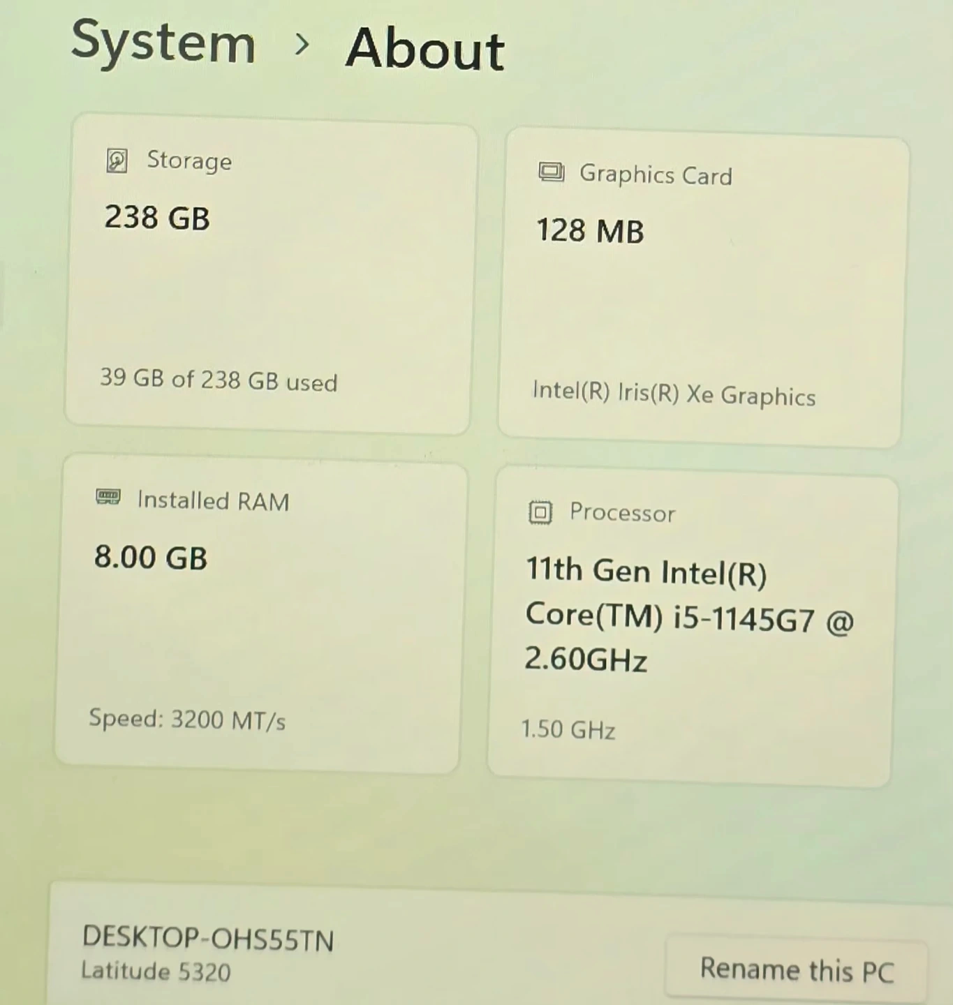 Dell Latitude 5320 laptop with an 11th Gen Intel Core i5 processor. It has 8GB of RAM and 238GB of storage. The laptop features Intel Iris Xe Graphics.