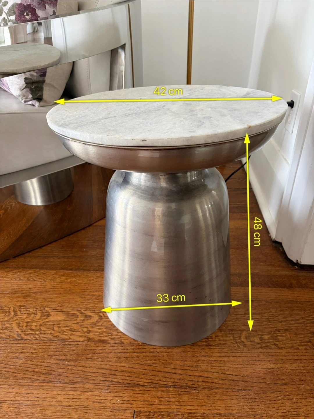 Stylish round marble top side table with sculptural metal pedestal base. The combination of natural stone and brushed metal creates a modern, high-end look that works beautifully beside a sofa, armchair, or bed.