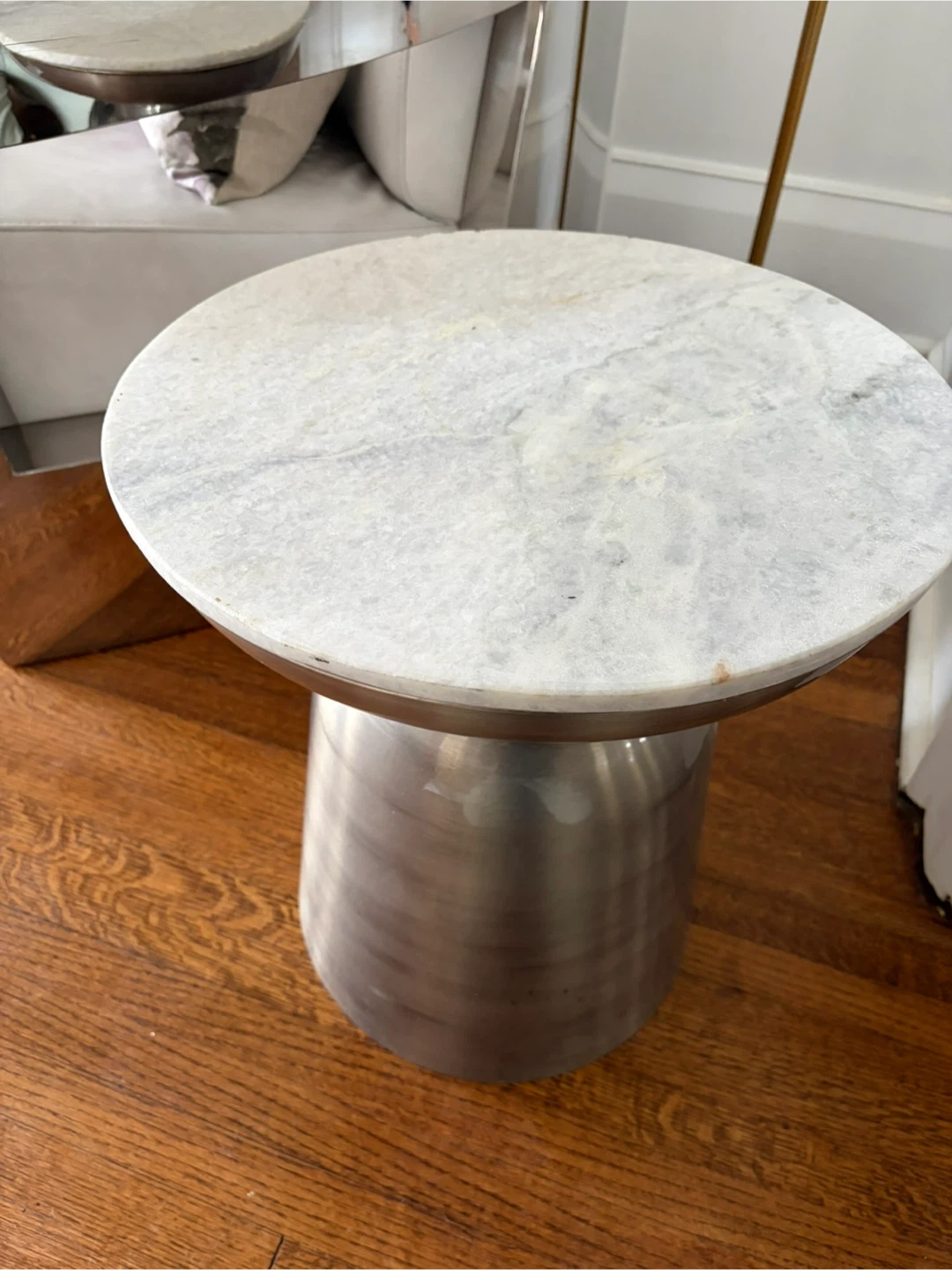 marble side table, marble top table, pedestal side table, modern side table, round marble table, accent table, end table, contemporary furniture, metal base table, living room side table, sofa table, designer style table