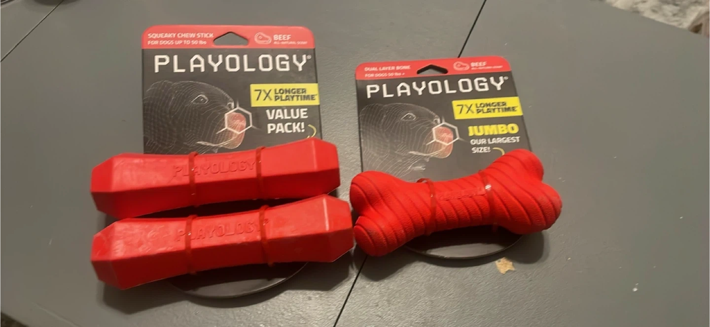 Includes a value pack of two Playology Squeaky Chew Sticks and one Jumbo Dual Layer Bone. These dog toys are beef flavored and designed for dogs up to 50 lbs. They offer 7x longer playtime! Each $7