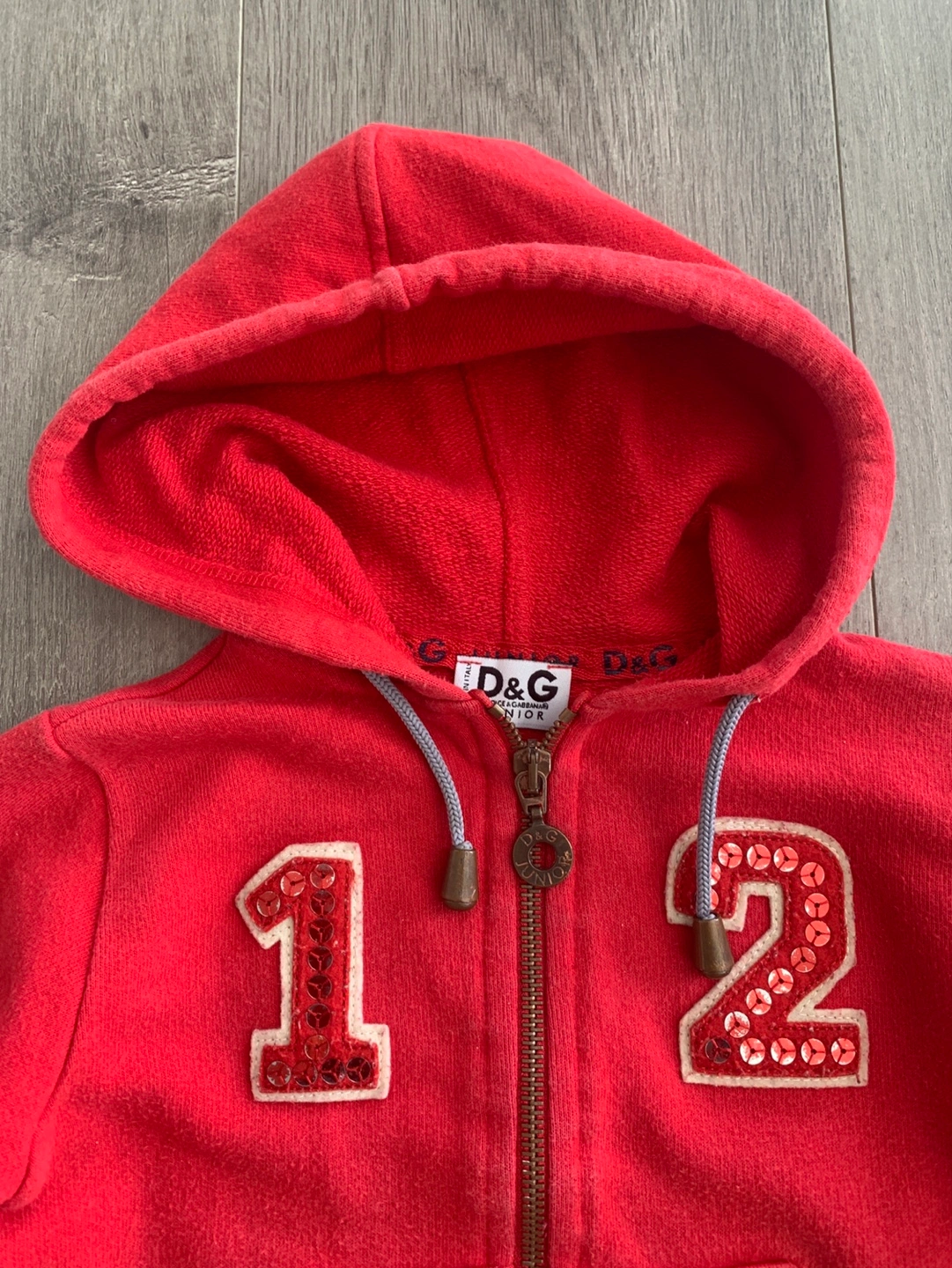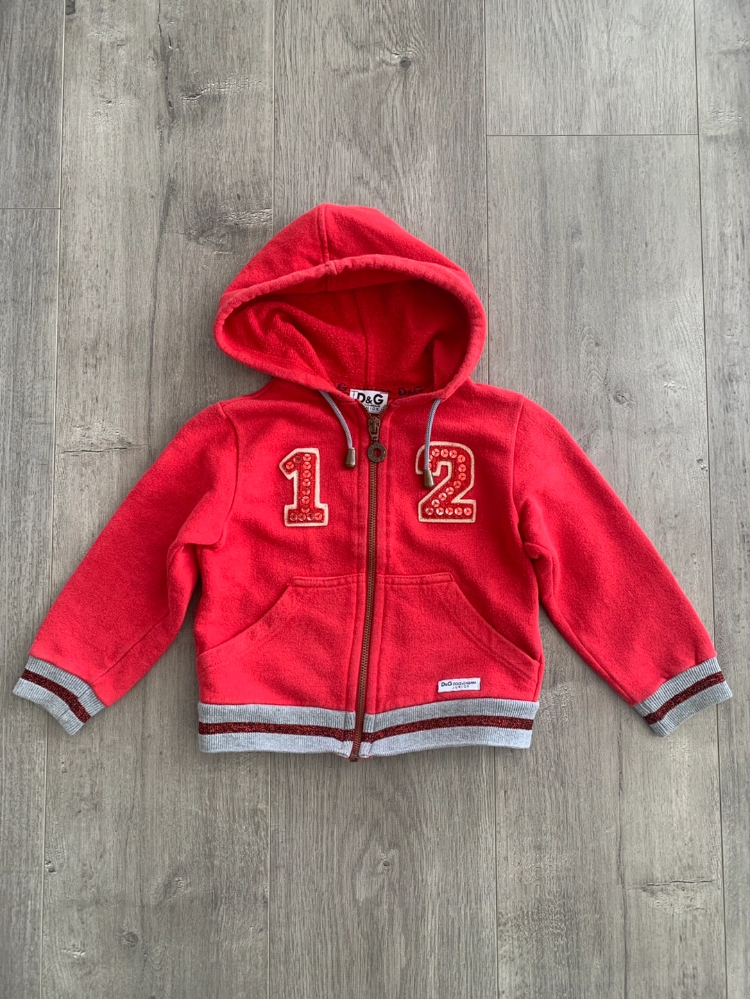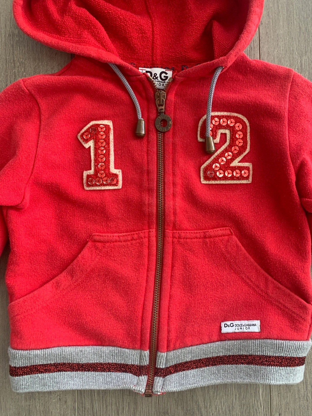 Red zip-up hoodie. Features a hood, grey and red sparkle ribbed cuffs, and sequined 12 appliqué. Dolce & Gabbana Junior branding. Size 98/ 3 Years