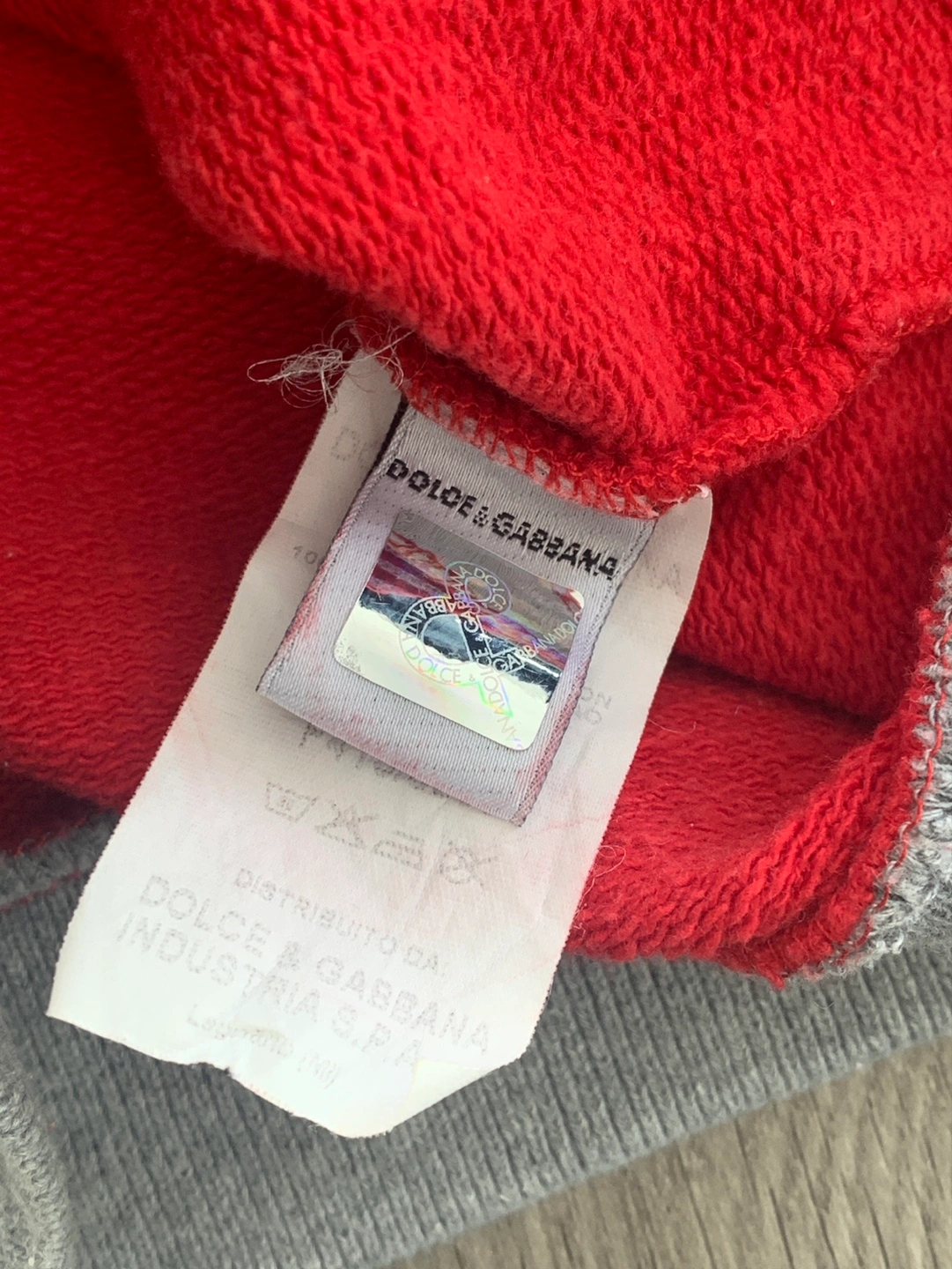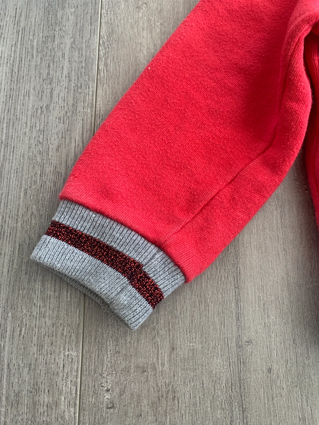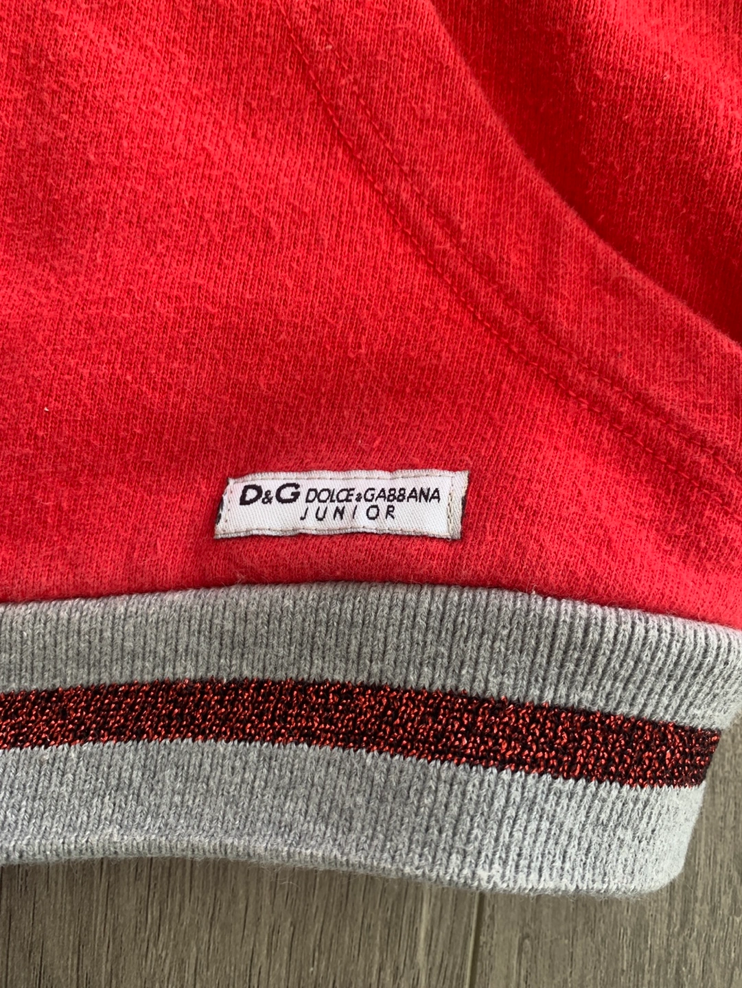 Red zip-up hoodie. Features a hood, grey and red sparkle ribbed cuffs, and sequined 12 appliqué. Dolce & Gabbana Junior branding. Size 98/ 3 Years
