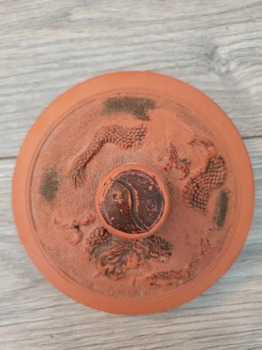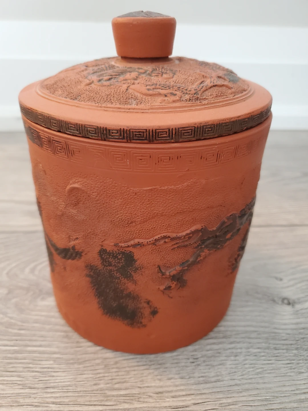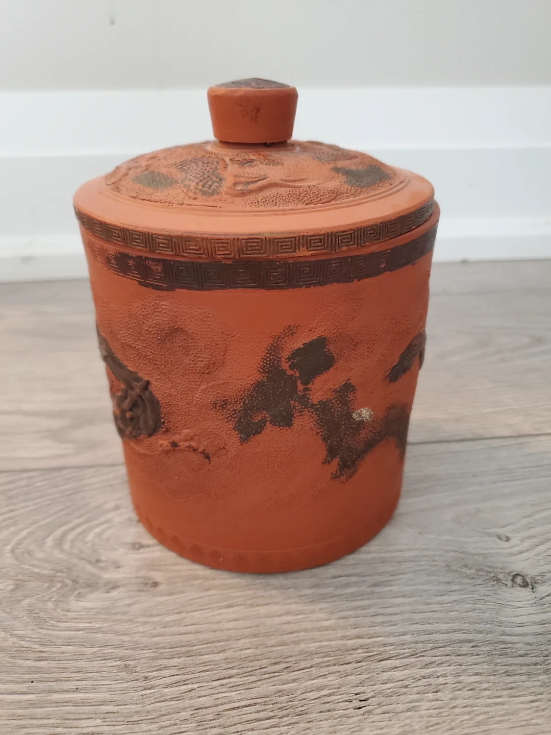 Here's a terracotta jar with a lid, perfect for adding a touch of rustic charm to your space. It features a unique design with what looks like dragons on the lid and sides. It's in great condition and ready for a new home!