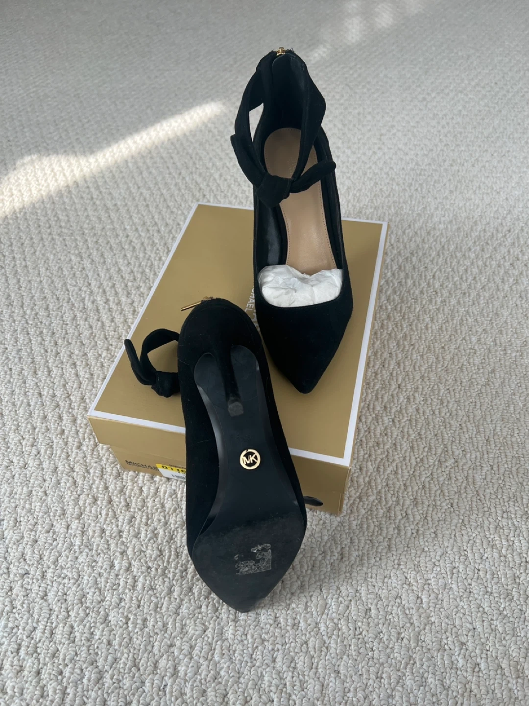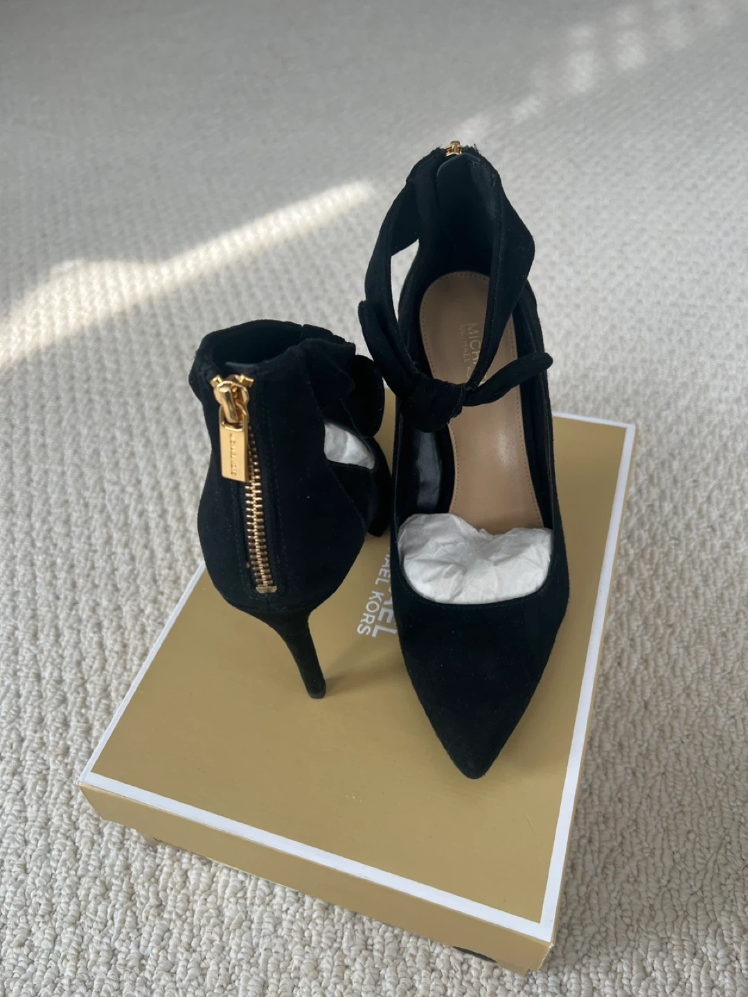 Michael Kors black suede heels with a gold zipper closure. Features a tie ankle strap and pointed toe. Original box included. Size 7.5. New, wore once to a wedding. Beautiful shoes. Asking 150.00 firm